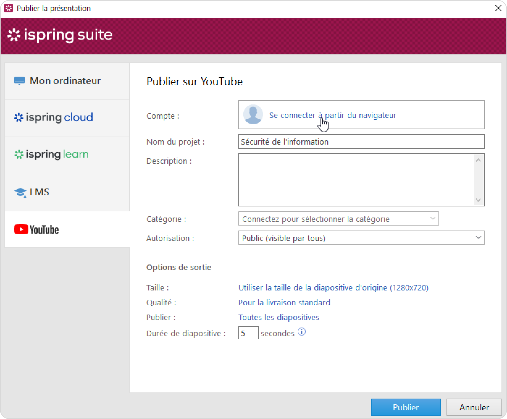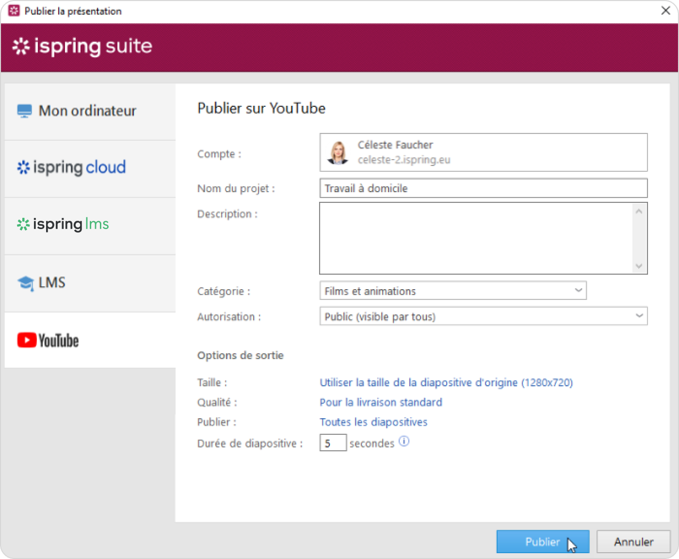 - Après votre connexion, iSpring vérifiera les informations de votre compte YouTube. Si vos données de connexion ont été correctement saisies, vous verrez les informations du compte dans le champ Compte. Ces informations seront enregistrées dans le système, de sorte que vous n'aurez pas à les saisir à nouveau la prochaine fois.