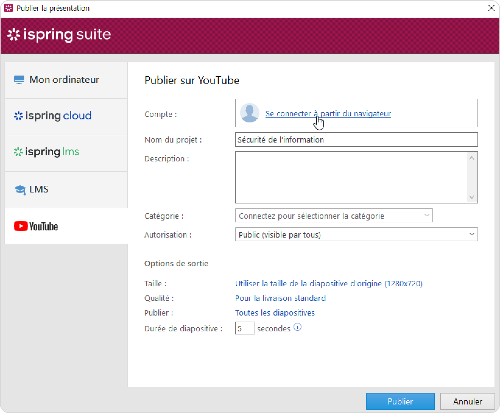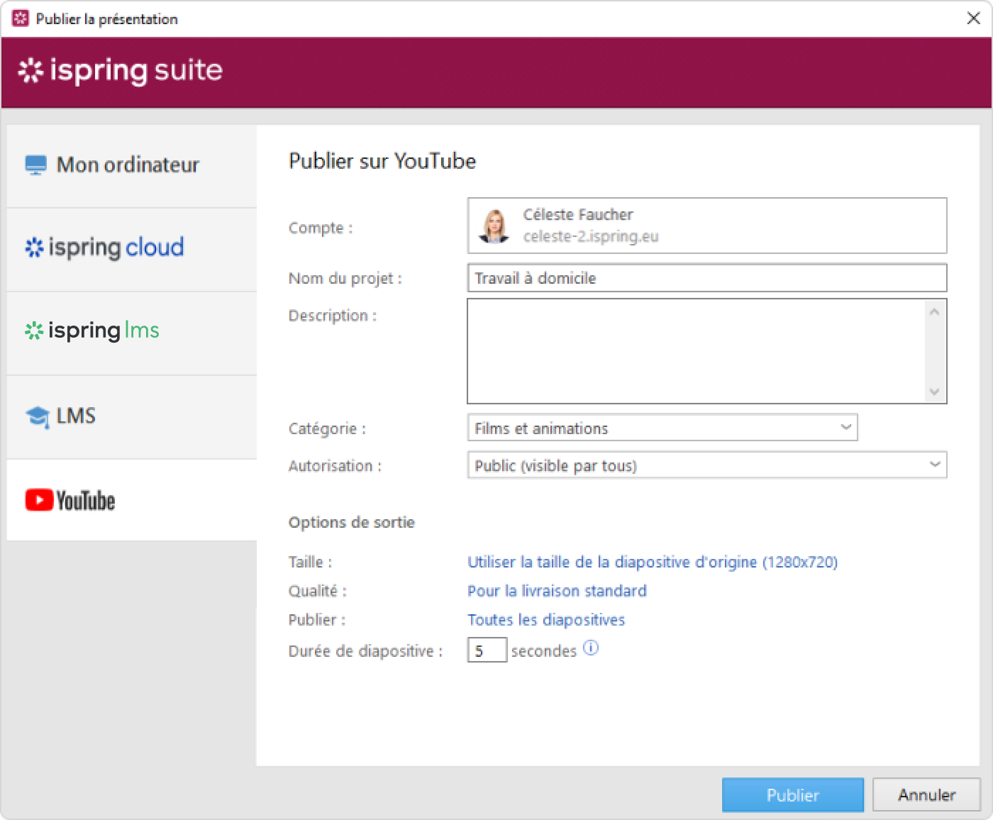 Convertissez votre cours en une vidéo et publiez-la sur YouTube directement depuis iSpring Suite. Tous les effets PowerPoint et iSpring Suite appliqués seront préservés.