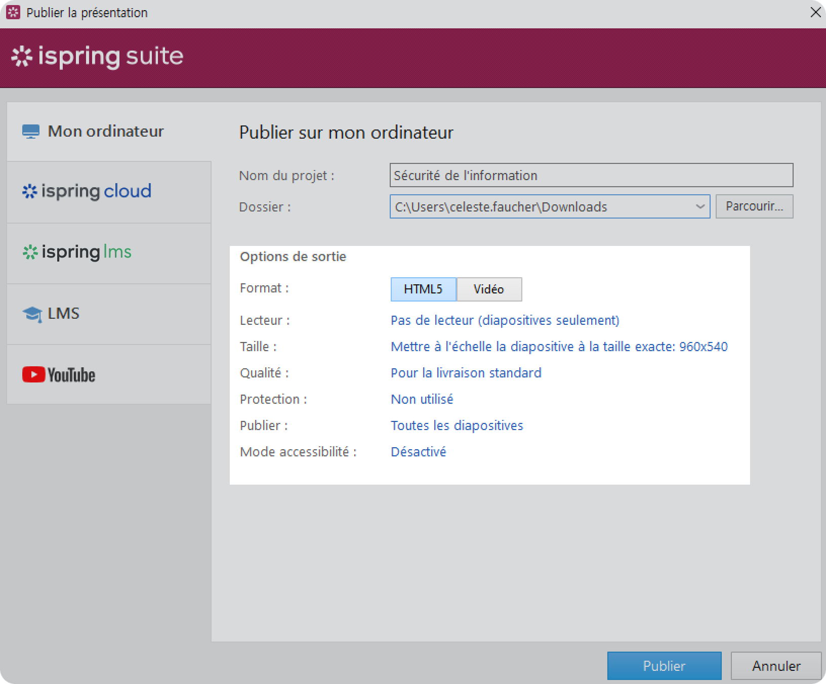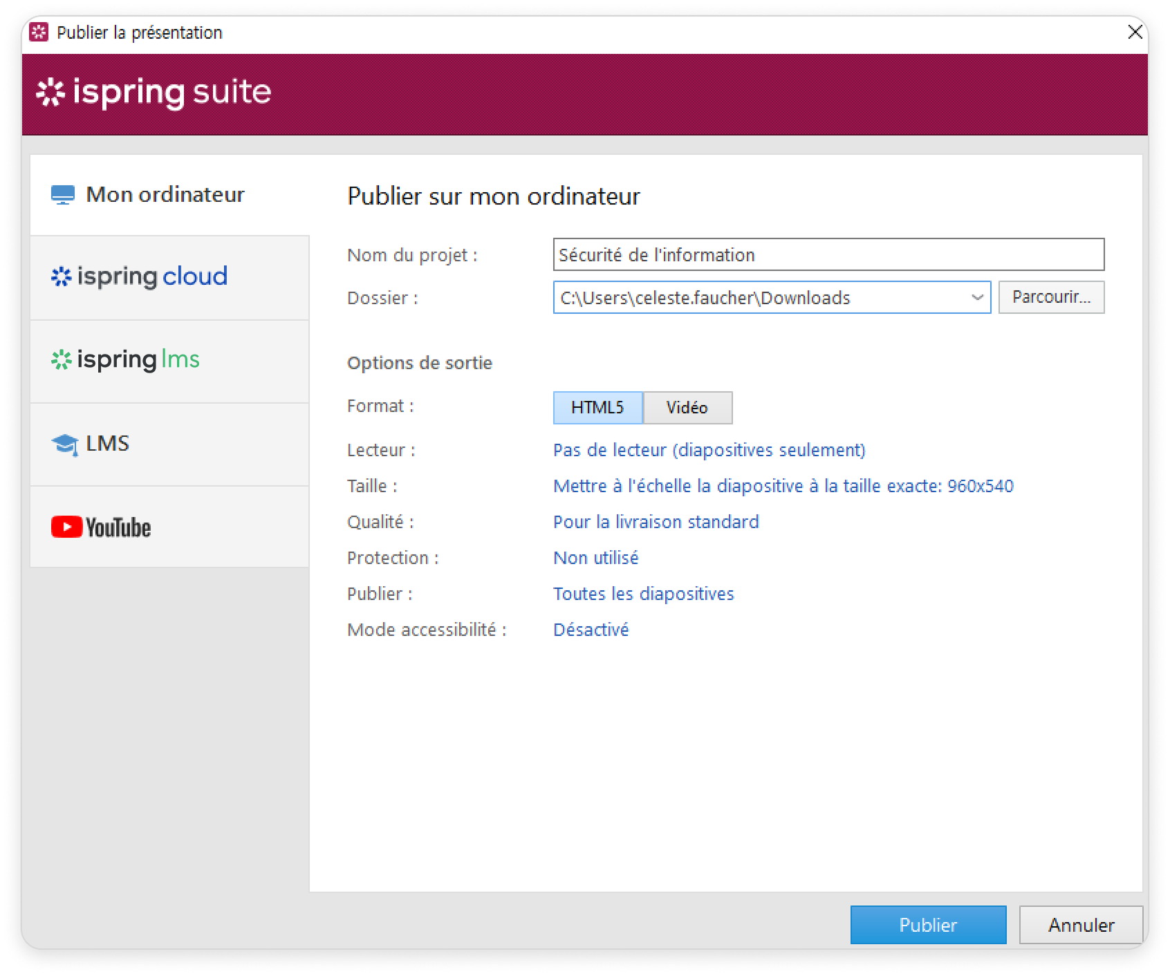 La publication sur l'ordinateur permet de sauvegarder un cours sur un disque local pour une distribution ultérieure. Publiez le cours converti sur votre site web, votre blog ou sur le réseau interne de votre organisation.