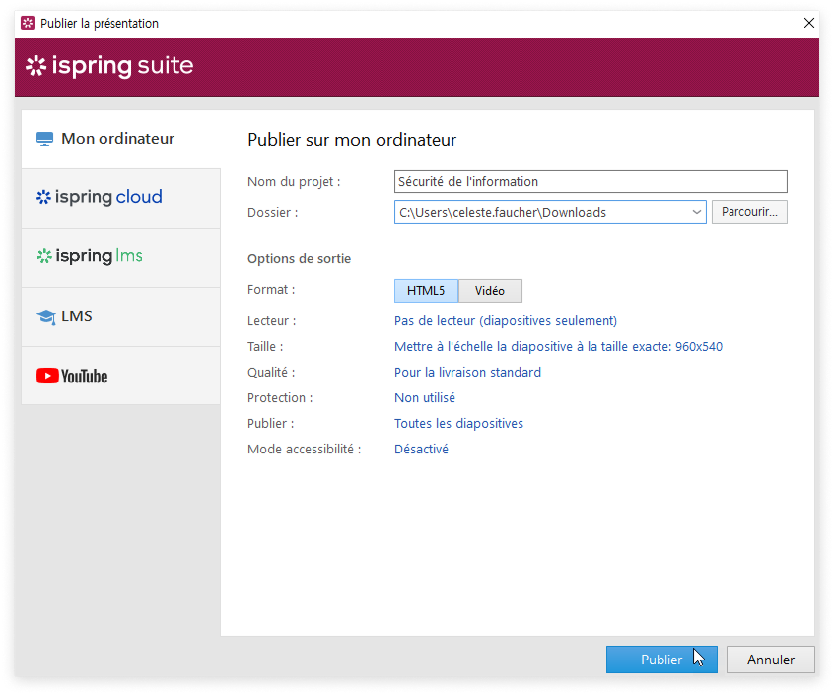 - Dans la fenêtre Publier la présentation, sélectionnez l'onglet Mon ordinateur. Par défaut, le nom du projet correspond au cours, mais vous pouvez le modifier.