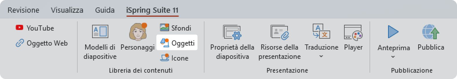 La Libreria dei contenuti iSpring contiene diversi dispositivi e forniture per ufficio. Inserire degli oggetti rende i contesti di apprendimento più realistici.