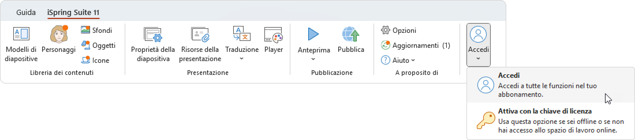 Puoi anche aprire un progetto e, sotto la scheda iSpring Suite, fare clic su Accedi.