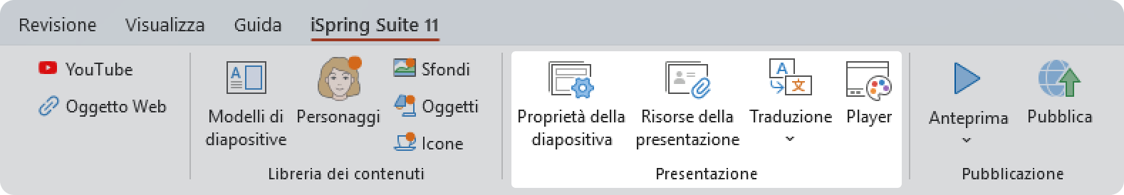 La scheda iSpring Suite 11 include la sezione Presentazione con strumenti per gestire la struttura e ulteriori risorse della tua presentazione. Ci sono tre strumenti per gestire una presentazione: