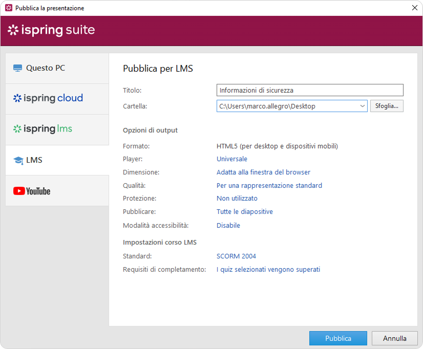 Pubblica un corso nel formato video e caricalo sul tuo canale YouTube. - Configura le opzioni di output e fai clic su Pubblica.