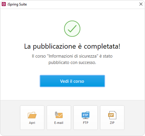 - Il corso è stato pubblicato con successo. Seleziona cosa farai in seguito con il corso: visualizzarlo, inviarlo via e-mail, caricarlo su un server or archiviarlo.