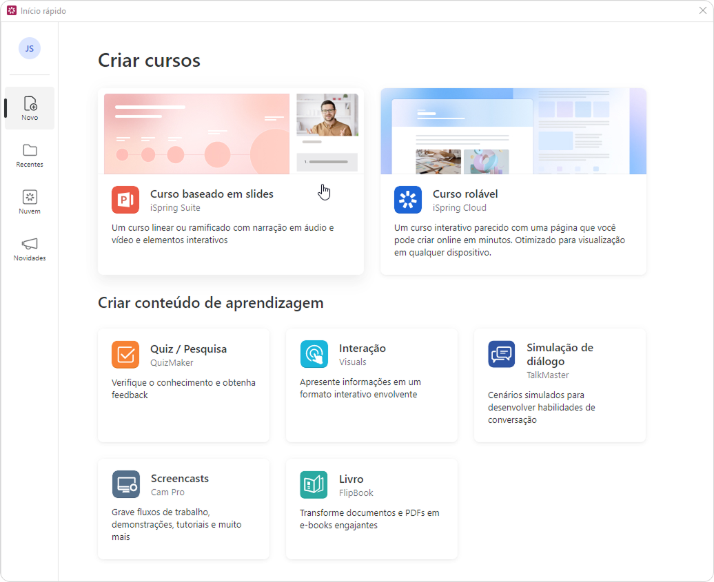 iSpring Suite é a versão mais recente do kit de ferramentas de criação de e-cursos iSpring Suite. Este novo lançamento se destaca entre todas as versões anteriores porque permite a criação de conteúdo tanto com o conhecido app de desktop quanto online — com o serviço de nuvem iSpring Space.