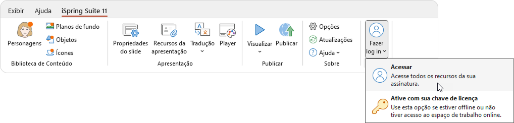 - Você também pode abrir um projeto e, na guia iSpring Suite, clicar em Fazer log in. Em seguida, selecione Acessar.
