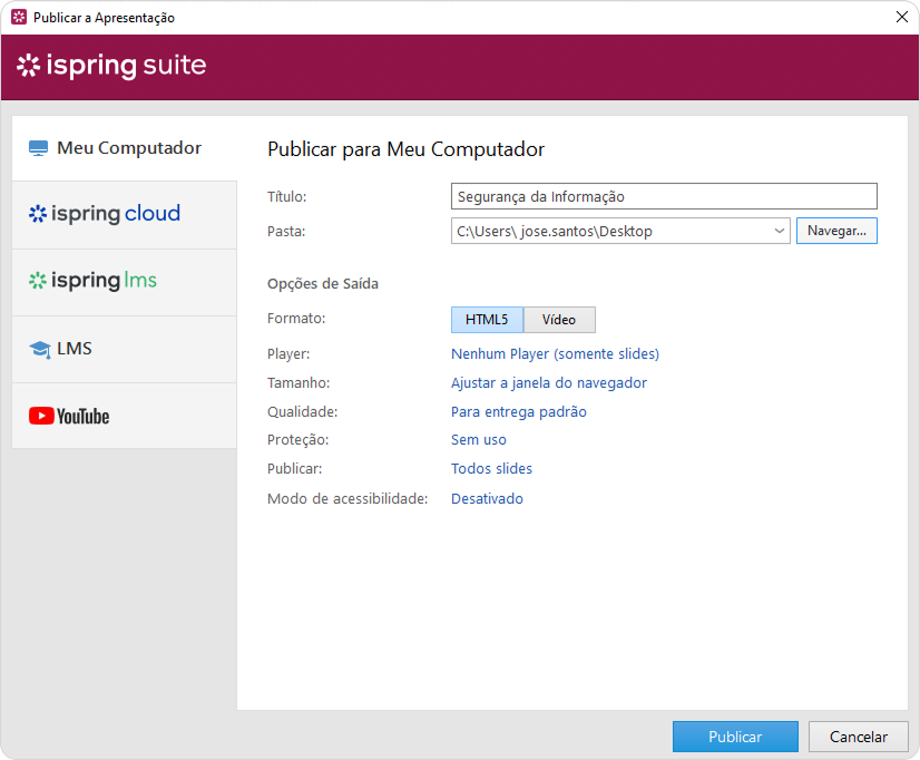 - Na janela Publicar a Apresentação, selecione a aba Meu Computador. Por padrão, o nome do projeto coincide com o nome do curso, mas você pode alterá-lo para qualquer nome desejado.