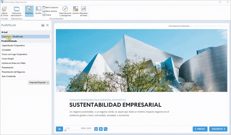 El reproductor universal viene con un conjunto de plantillas listas para usar para varios tipos de contenido. Para ver todas las plantillas disponibles, haga clic en el botón Plantillas en la barra de herramientas.