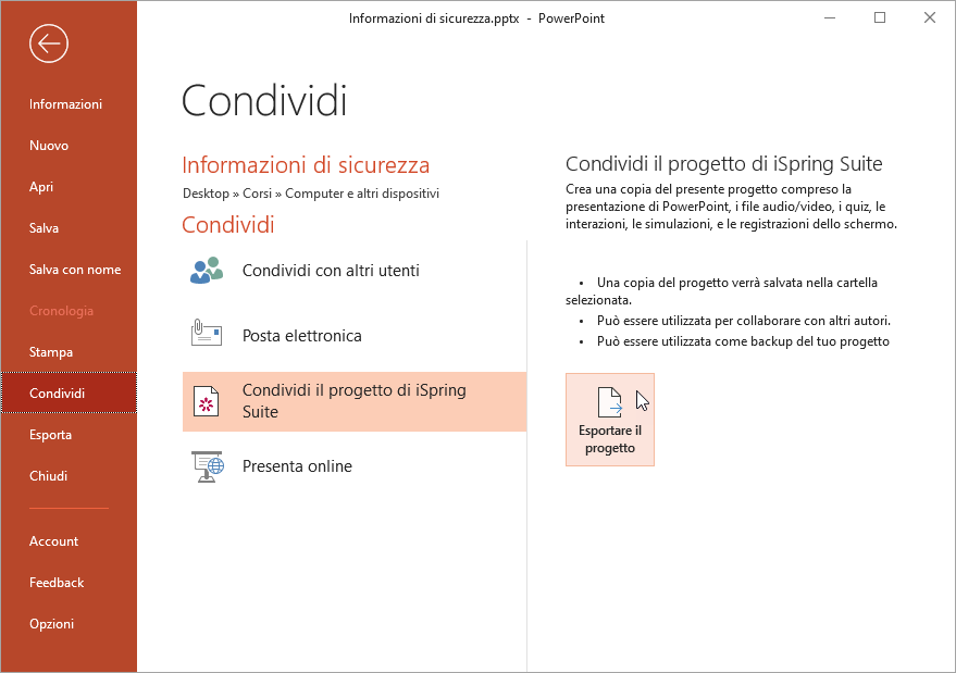 Esporta un corso creato con iSpring Suite insieme a tutte le sue risorse: foto, video, quiz e impostazioni. Puoi usare questo progetto per le seguenti finalità: