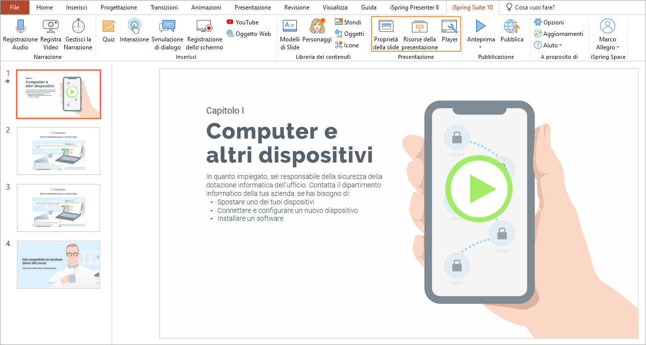 La scheda iSpring Suite 10 include la sezione Presentazione con strumenti per gestire la struttura e ulteriori risorse della tua presentazione. Ci sono tre strumenti per gestire una presentazione: