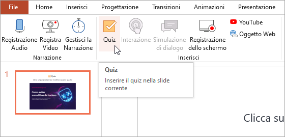 • Seleziona la diapositiva con il quiz e fai clic sul pulsante Quiz nella barra degli strumenti.