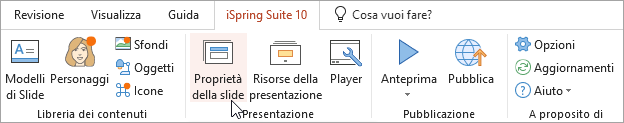 • Aprire la diapositiva con il quiz e fare clic sul pulsante Proprietà della slide nella barra degli strumenti.