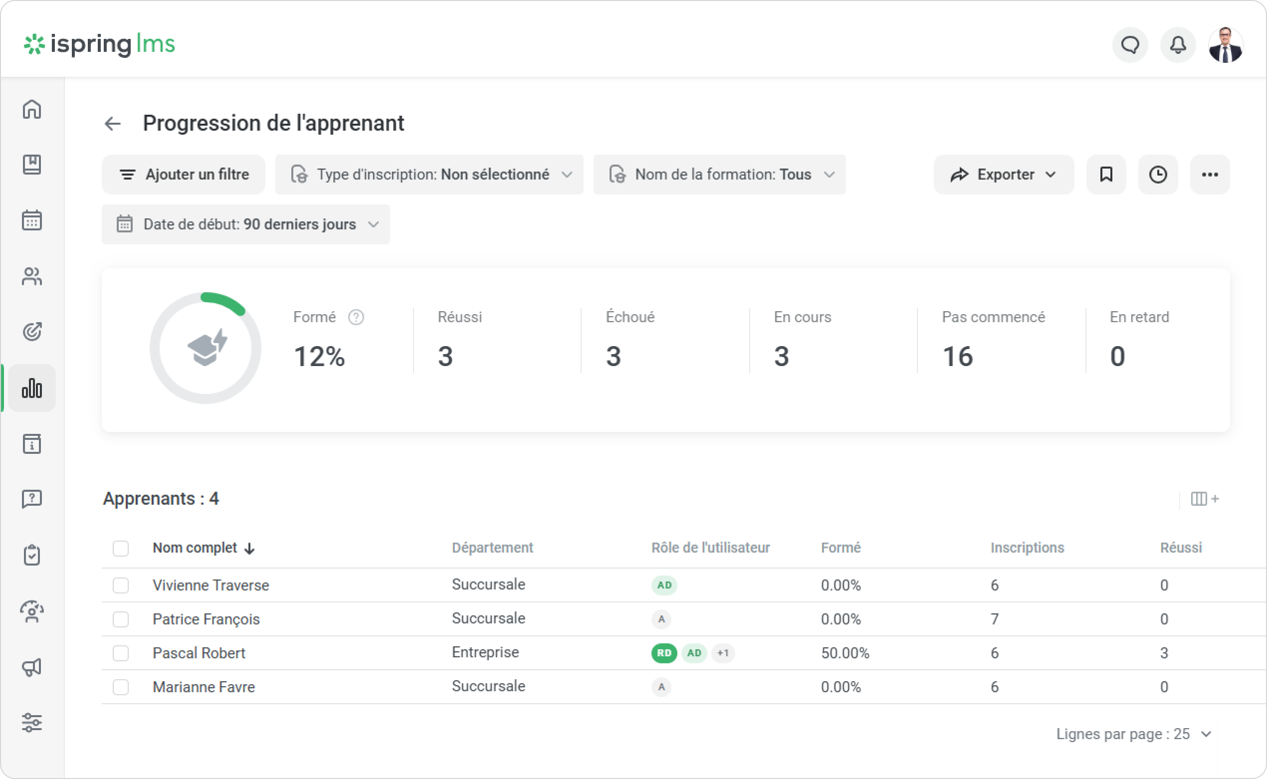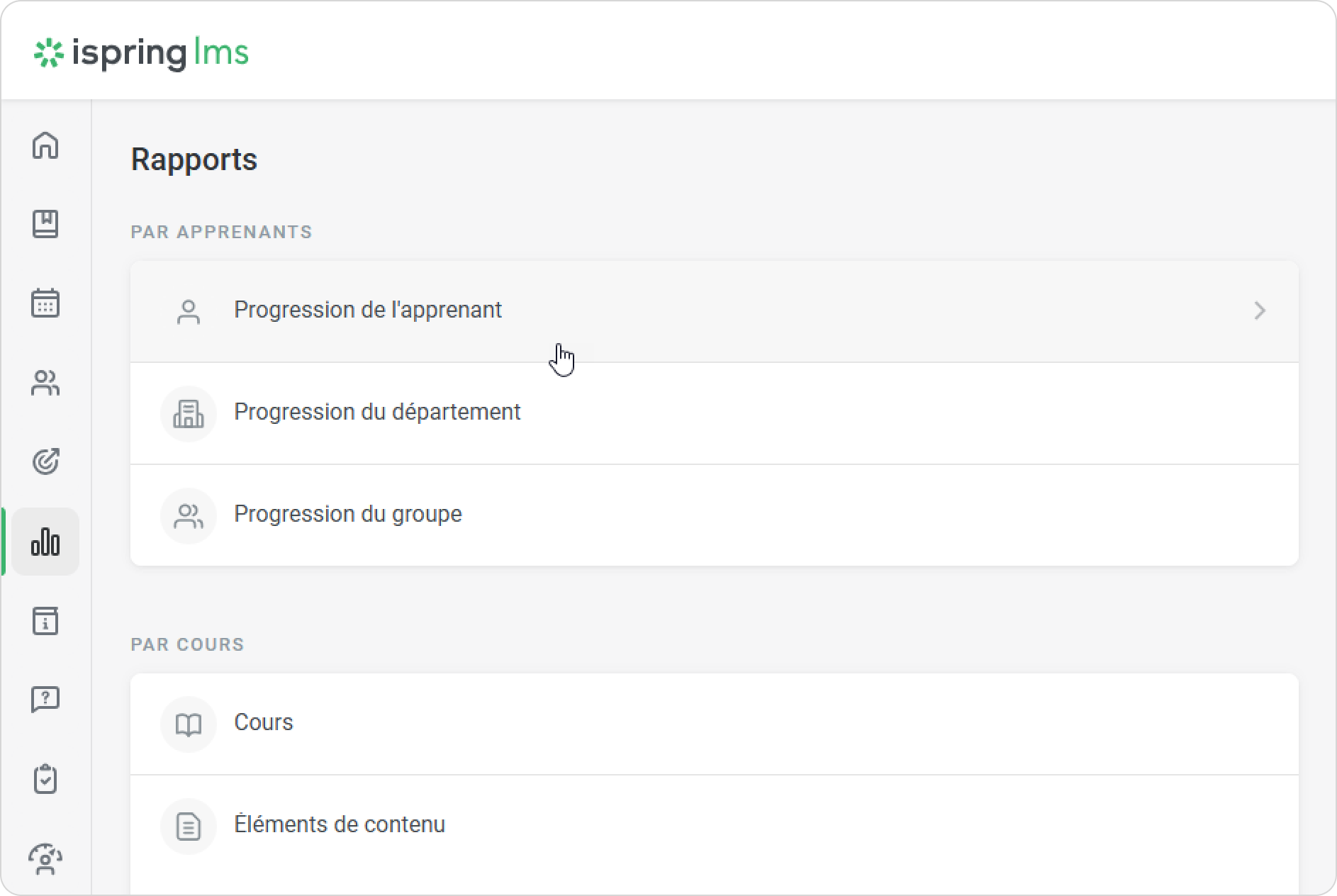 - Ouvrez la section Rapports, cliquez sur Progression de l'apprenant, et le rapport s'ouvrira sur la même page.