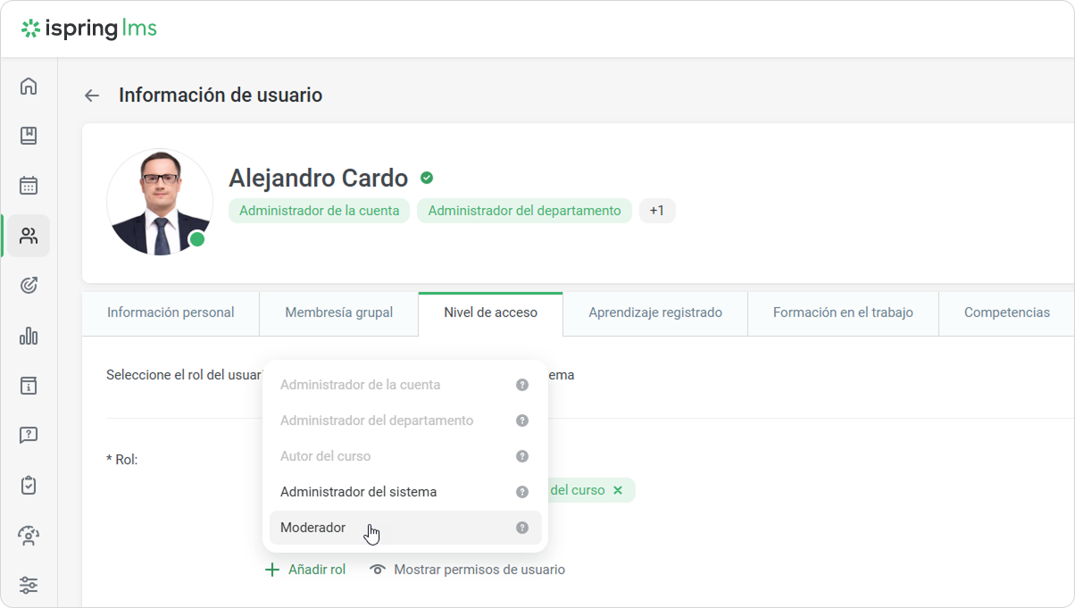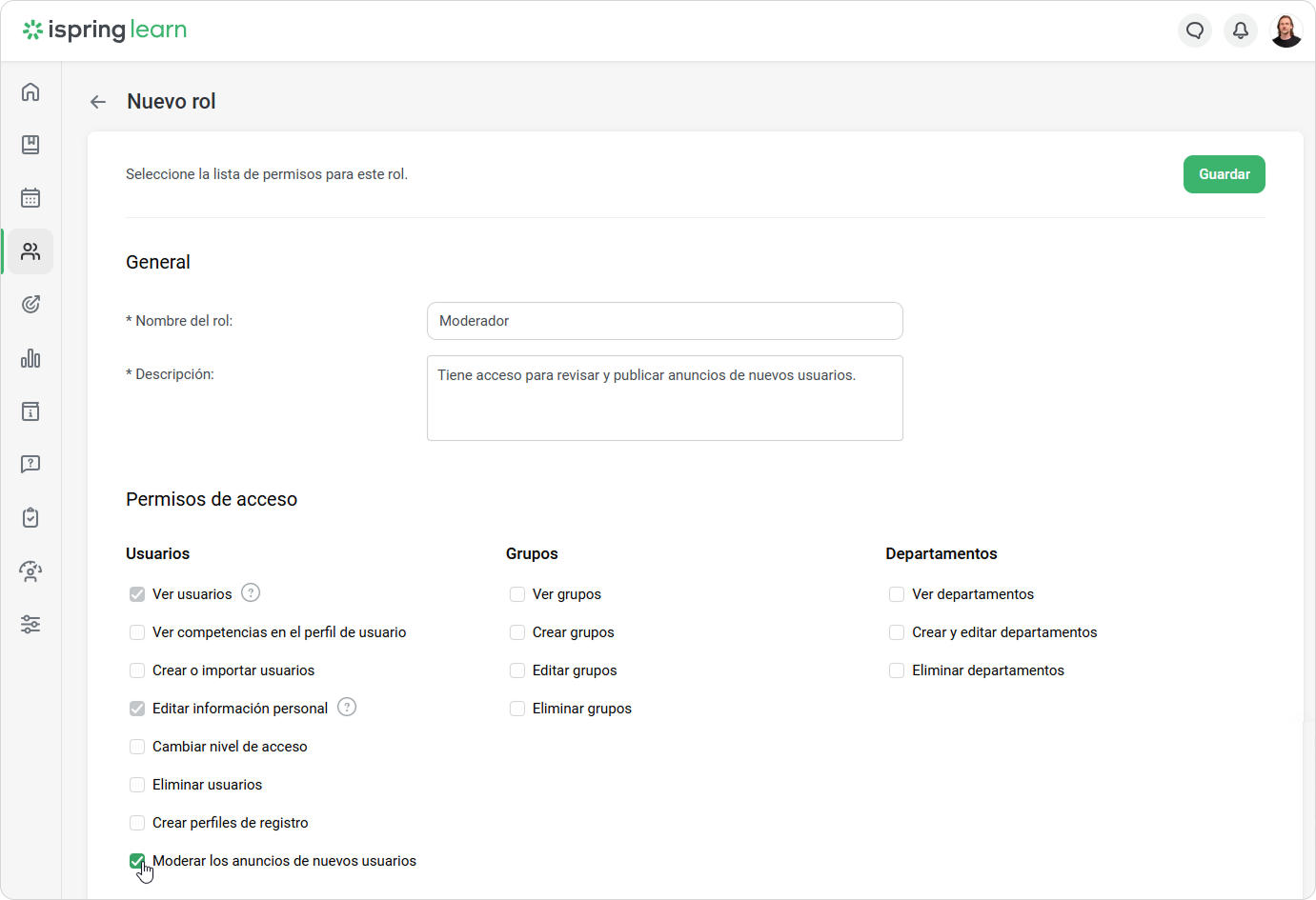 1. Para añadir un moderador, vaya a la sección Gestionar usuarios y asigne al usuario un rol con permiso de acceso para Moderar los anuncios de nuevos usuarios.