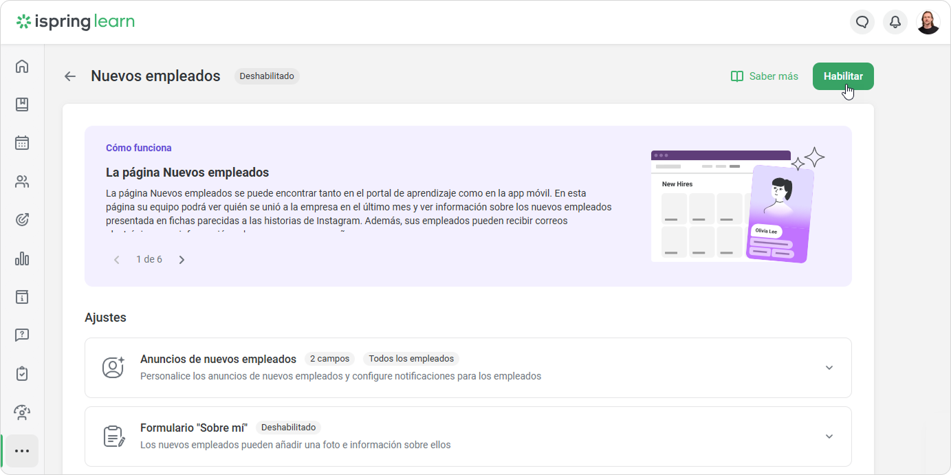 7. Para pedir a un nuevo empleado que rellene el formulario cuando inicie sesión en el portal de aprendizaje, seleccione Habilitar formulario "Sobre mí".