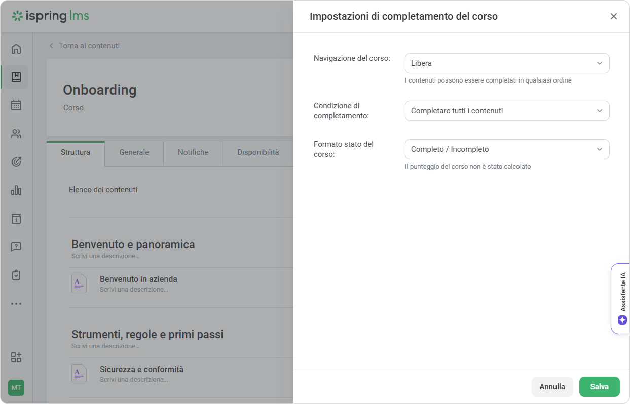 Nella finestra Impostazioni di completamento del corso, seleziona le impostazioni desiderate e fai clic su Salva.