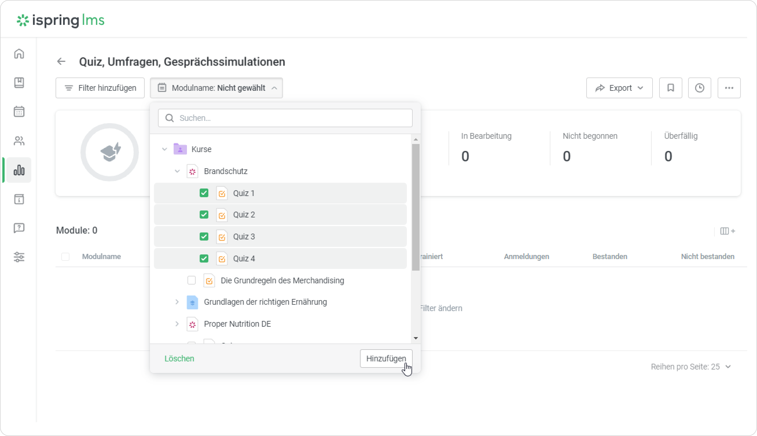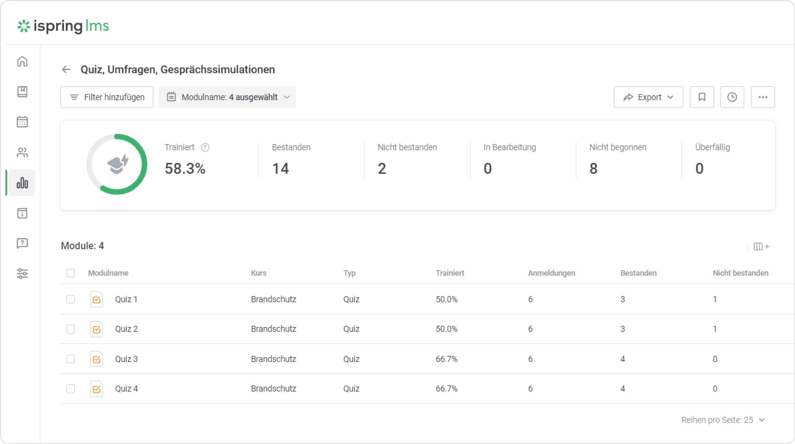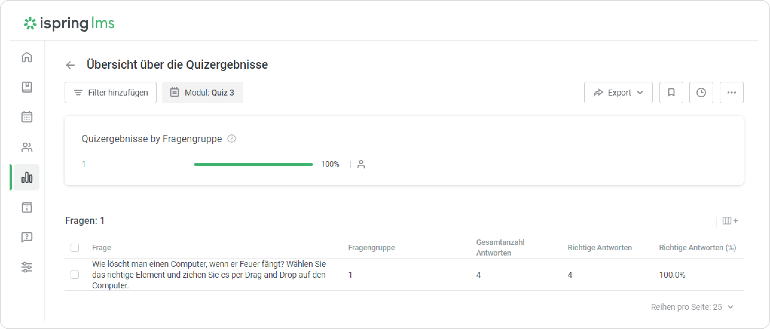 Berichte zu Quizfragen, Umfragen und Simulationen helfen dabei, wiederkehrende Themen zu identifizieren und Schulungen besser zu organisieren. Erstellen Sie einen Bericht zu Modulen und rufen Sie detailliertere Statistiken für eine Gruppe von Fragen im Quiz auf:
