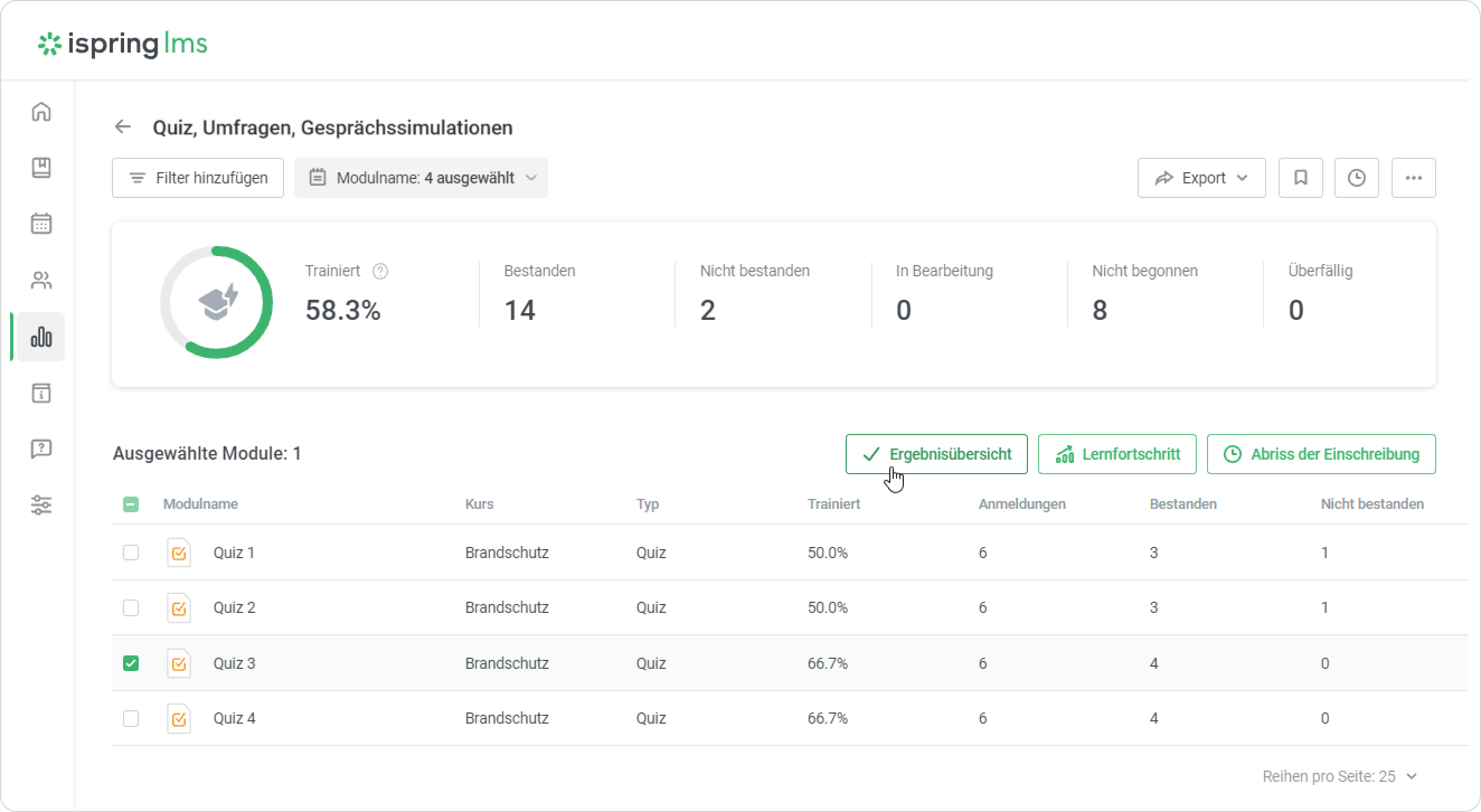 - Wählen Sie in der Modulliste ein Quiz aus und klicken Sie auf die Schaltfläche Ergebnisübersicht.