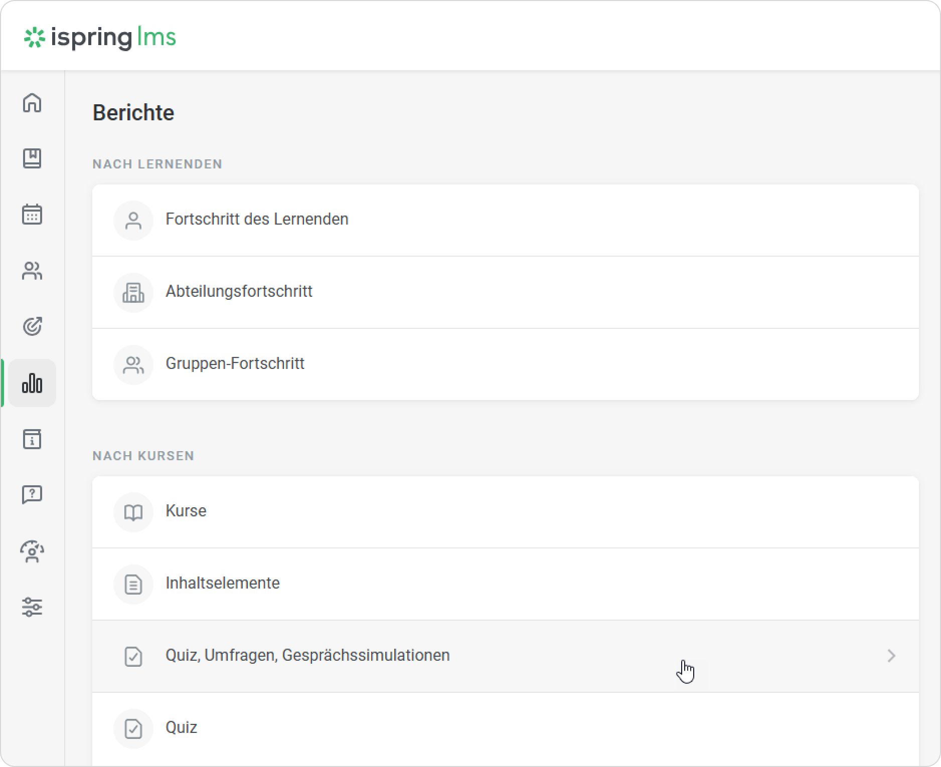 Dieser Bericht zeigt die Ergebnisse von bestandenen Quiz, Umfragen und Simulationen, die als Teil eines Kurses, als eigenständiges Material oder innerhalb einer Suite-Präsentation erstellt wurden.