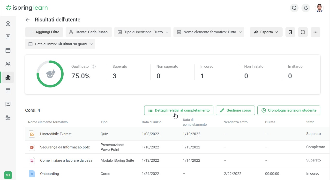 Se un quiz, dialogo o sondaggio è incluso in un corso, prima vai al report Dettagli del corso. Poi, seleziona il contenuto necessario e fai clic su Dettagli di relativi al completamento. - Si aprirà un report con i risultati di completamento. Qui visualizzerai tutti i tentativi per superare il quiz, dialogo o sondaggio e il numero di punti ottenuti, il punteggio minimo e la data di completamento.
