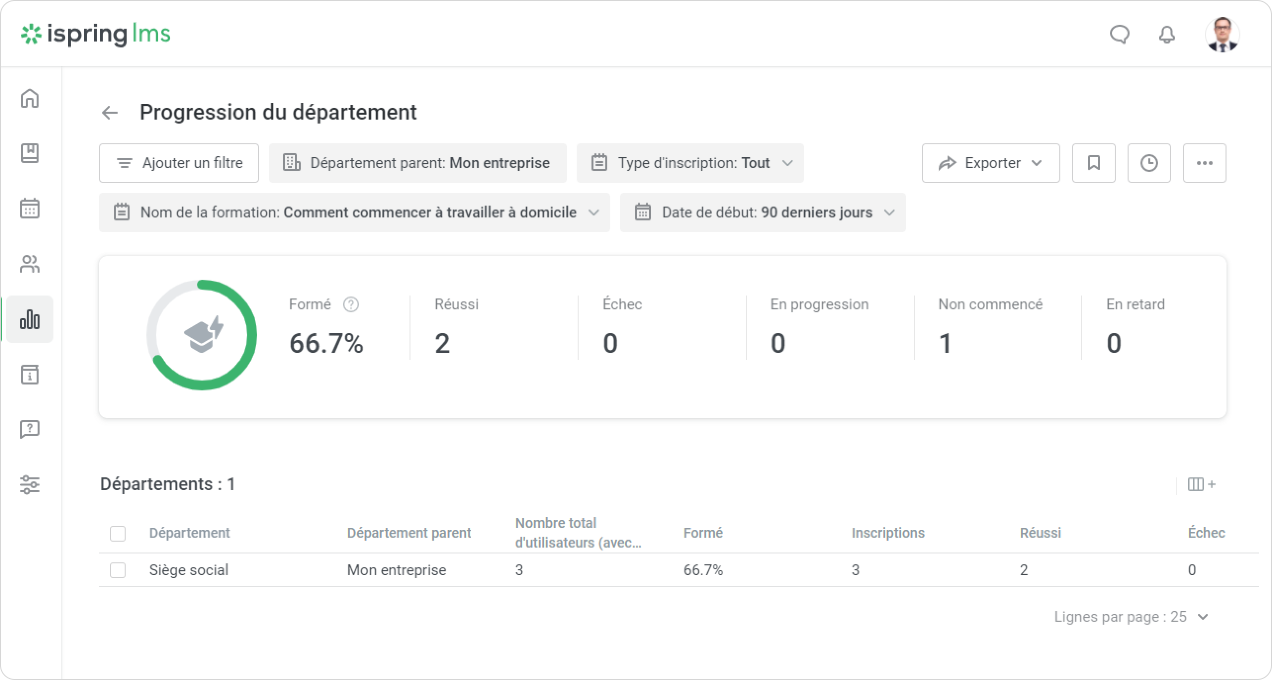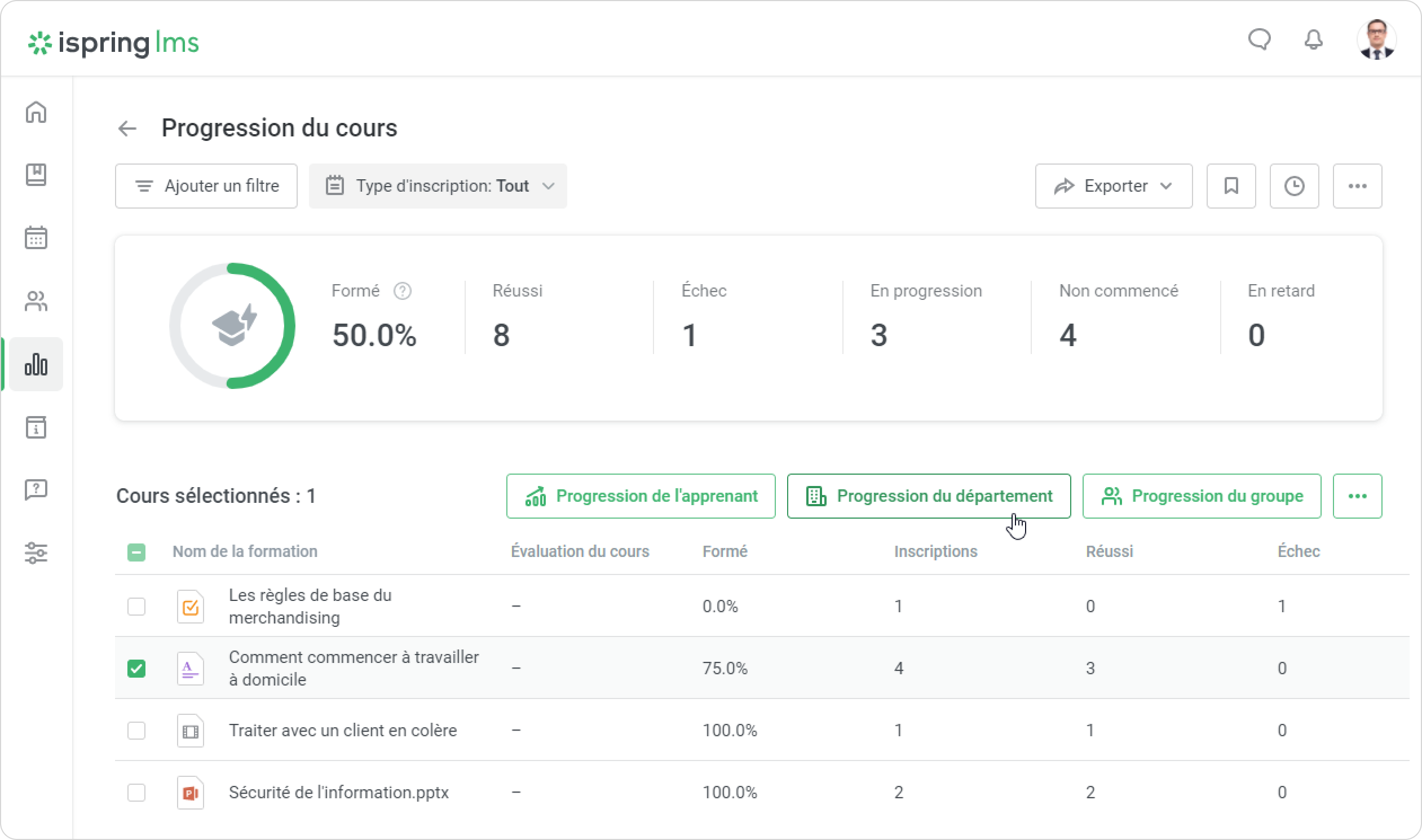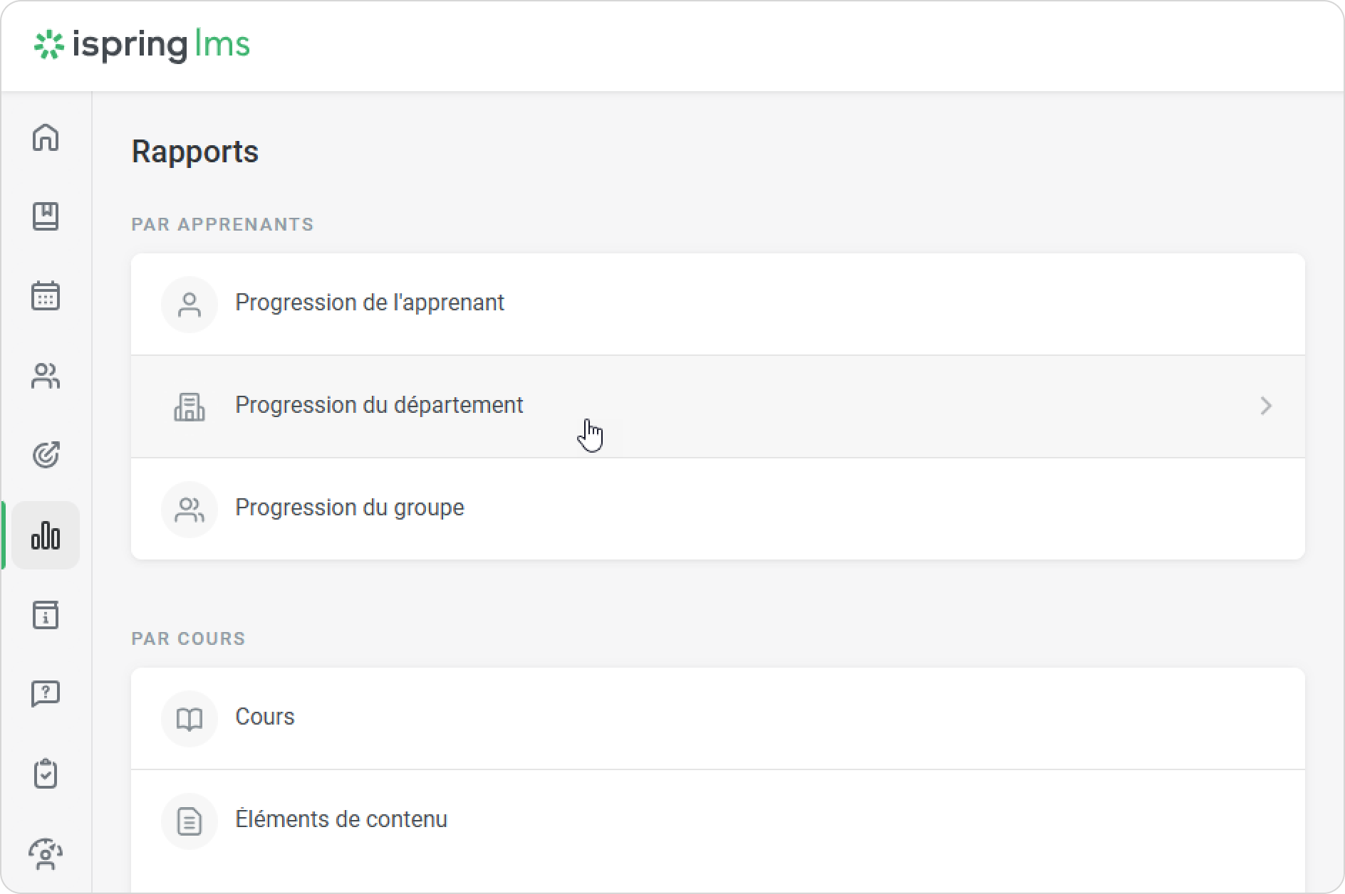 Ouvrez la section Rapports, cliquez sur Progression du département, et le rapport s'ouvrira sur la même page.