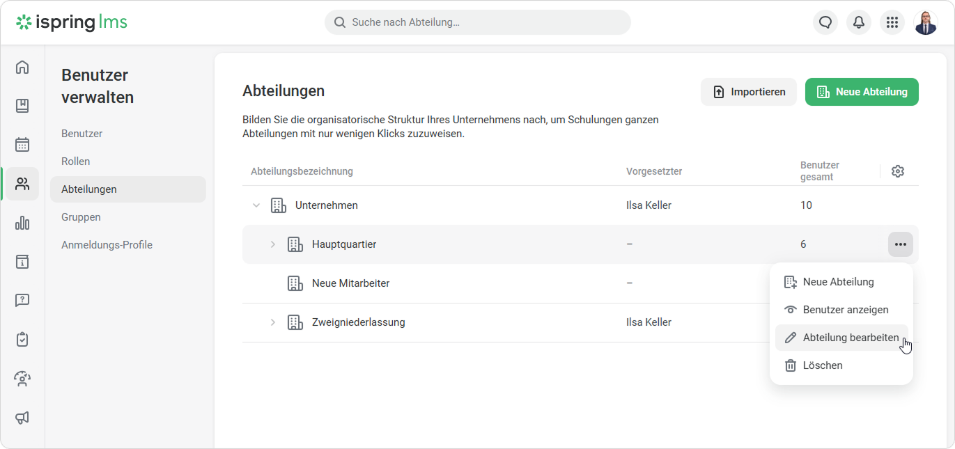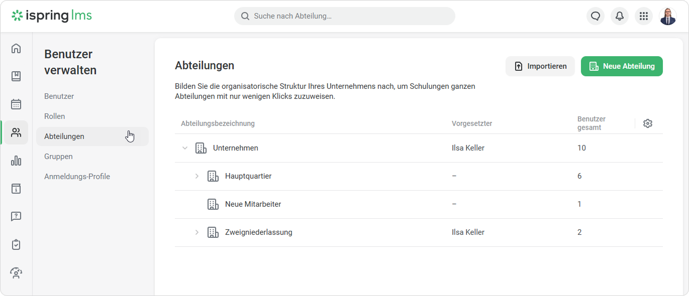 In iSpring Learn LMS kann ein höherer Manager den Fortschritt der Schulungen einer untergeordneten Abteilung verfolgen.