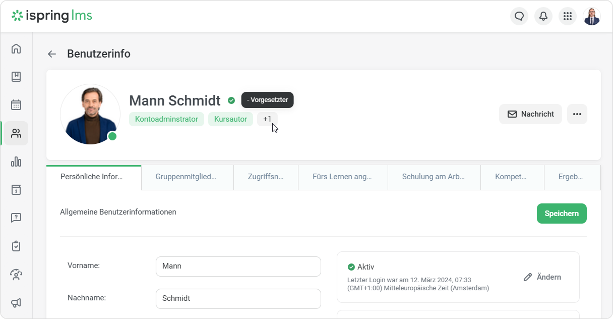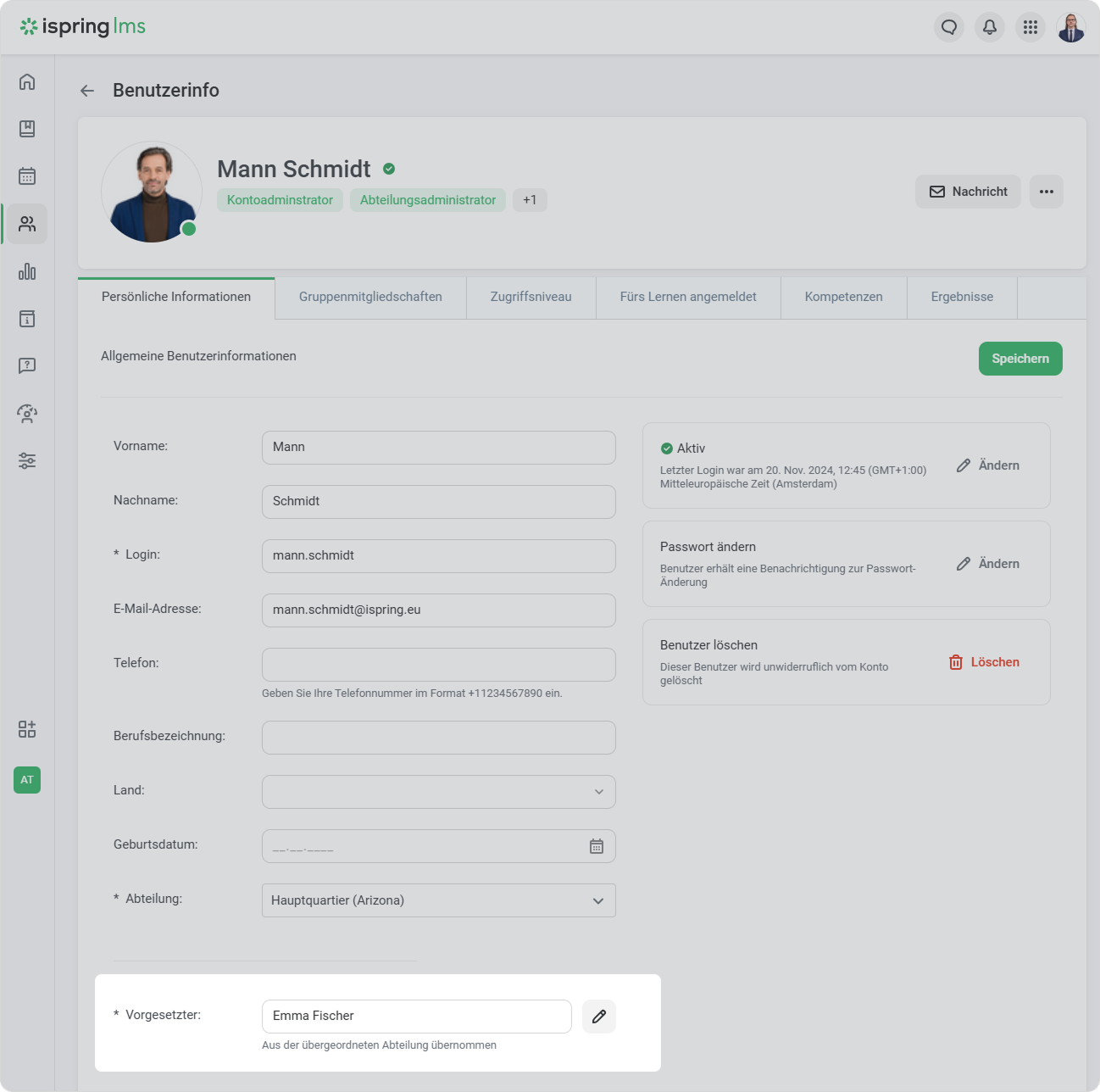 Sie werden Informationen über den Vorgesetzten auf der Benutzerinformationsseite Benutzerinfoseite sehen.