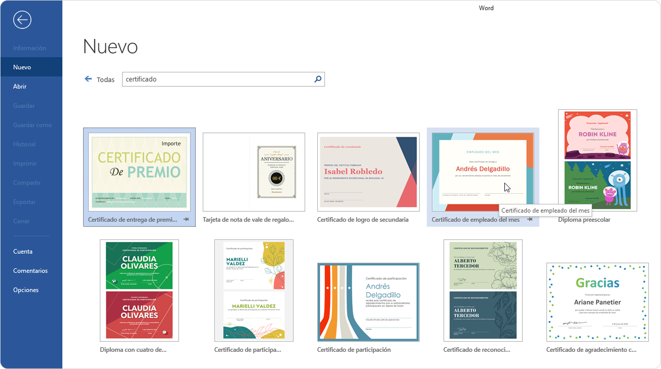 1. Abra un nuevo documento en Word y seleccione una plantilla de certificado.