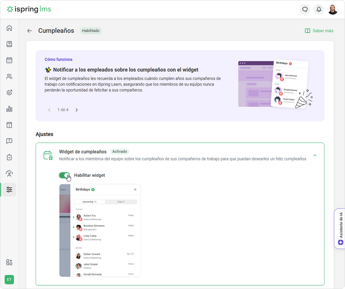 - Active el Widget de cumpleaños para recordar a los empleados sobre los cumpleaños de sus compañeros.