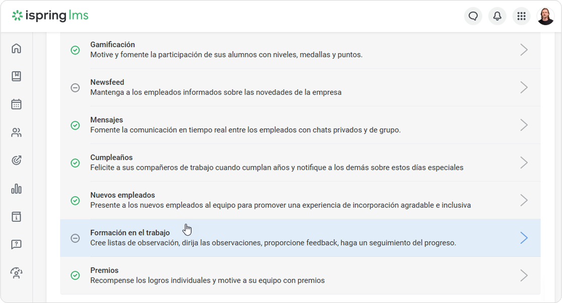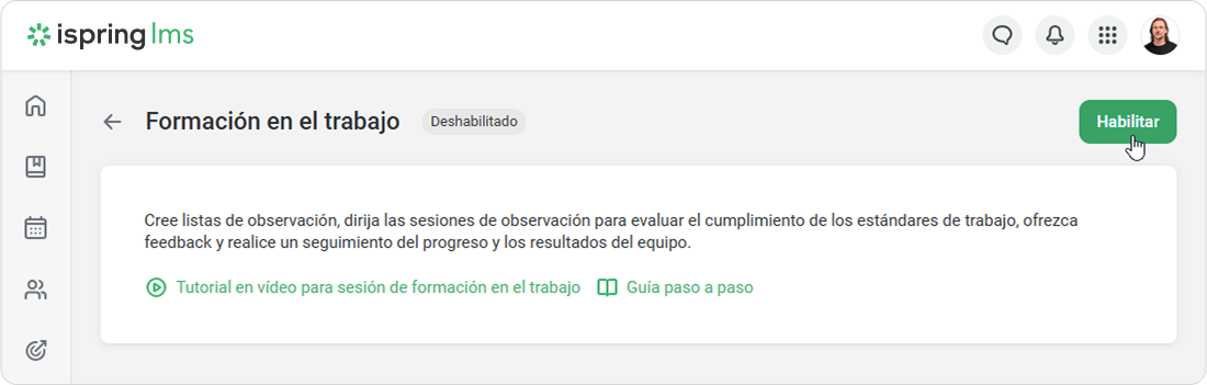 ¡Listo! Ahora verá el módulo de Formación en el trabajo en la barra lateral. Aquí puede crear listas de observación y dirigir sesiones de formación.