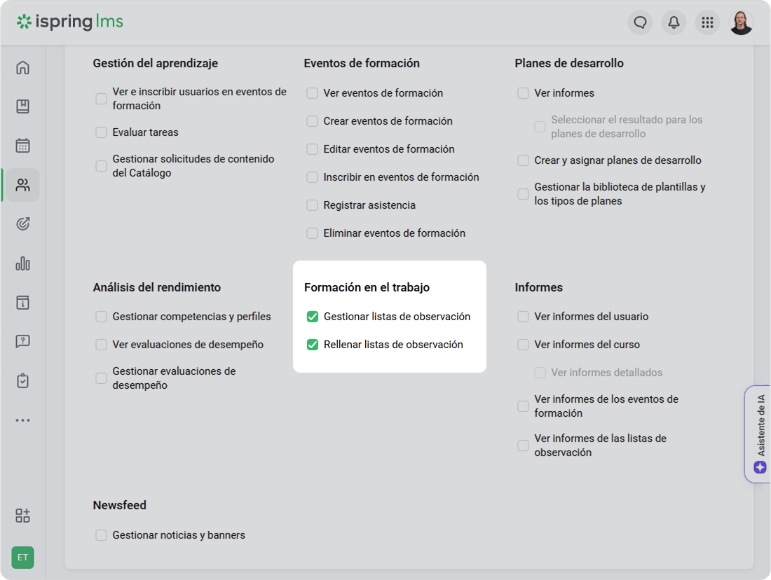 Supongamos que el observador necesita dirigir un evento de formación en el Portal del usuario. Puede añadirlo a iSpring LMS y crear un rol personalizado que le permita dirigir sesiones en el Portal del usuario sin tener acceso al Portal del administrador. Para hacer esto: