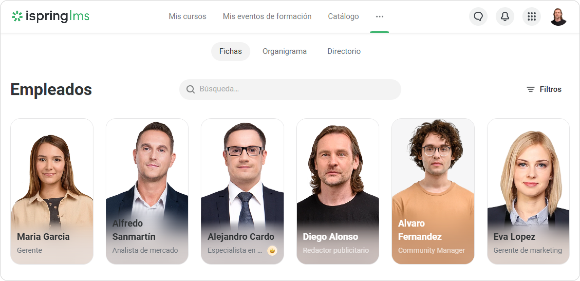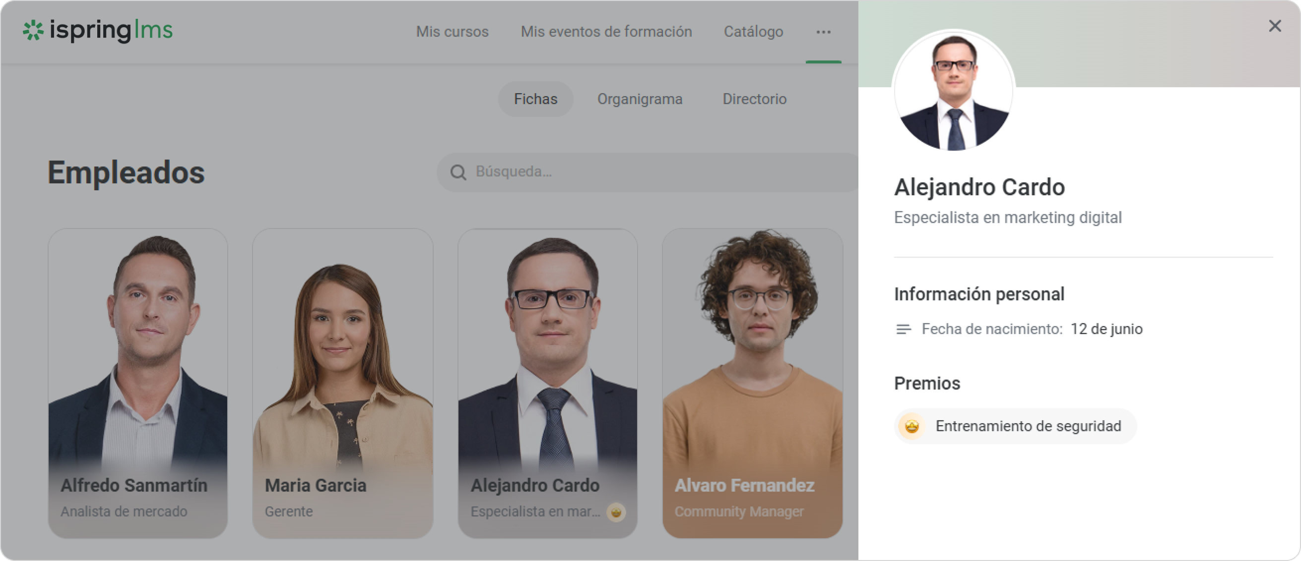Al hacer clic en una ficha accederá al perfil del empleado correspondiente, donde podrá encontrar información más detallada, como el departamento al que pertenece el empleado, su supervisor e información personal y de contacto.