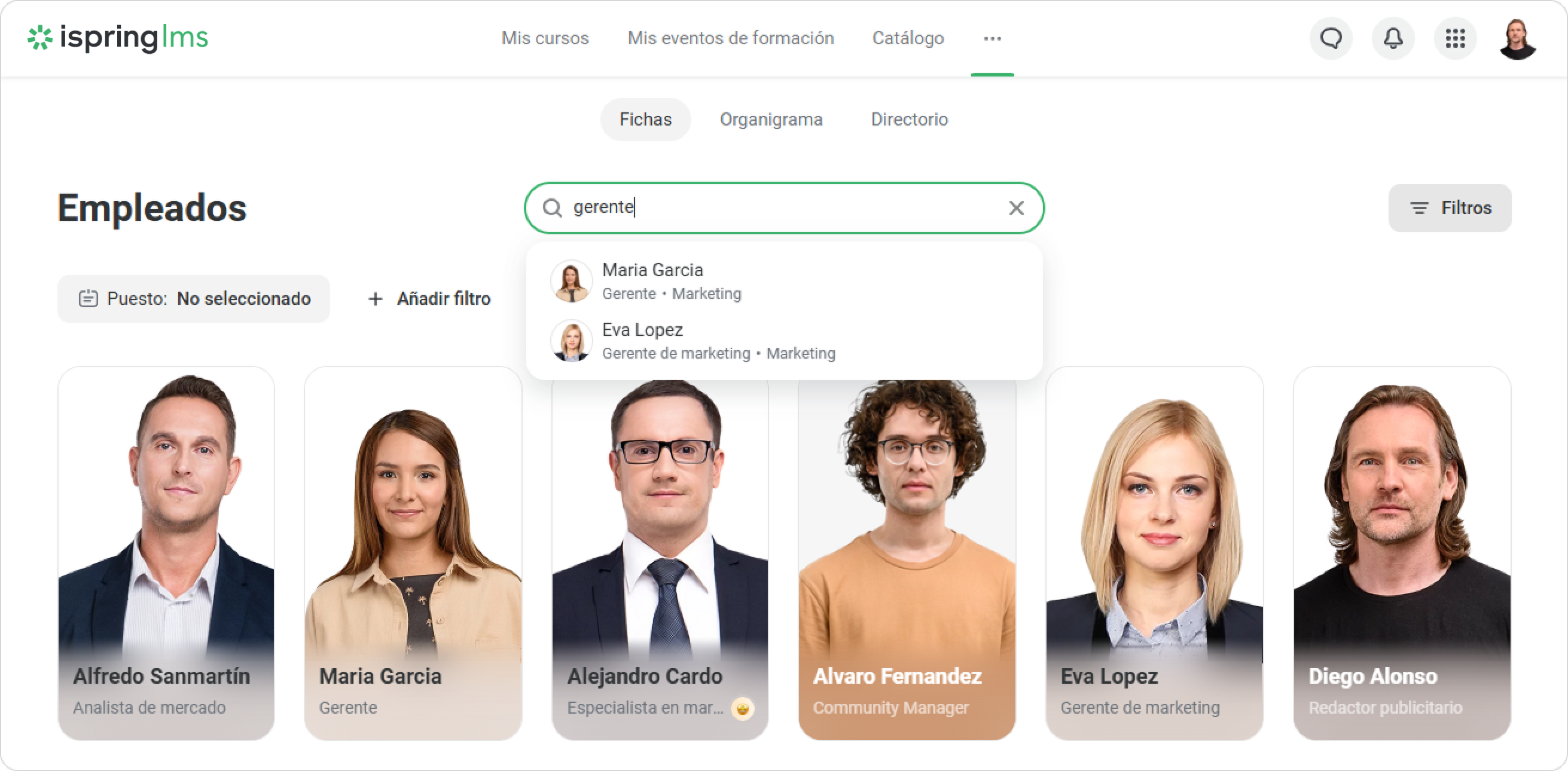 Utilice la barra de búsqueda para encontrar a un empleado por su nombre u otros datos. O aplique filtros para ver empleados específicos, como los empleados con el puesto de “Gerente de éxito del cliente”.