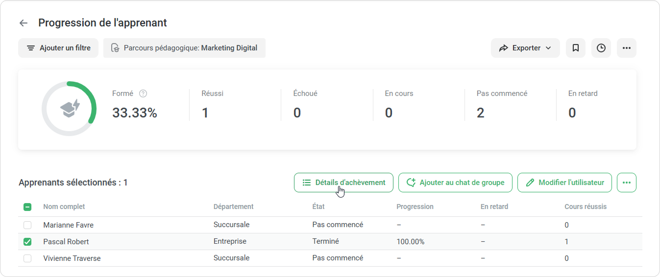 - Sélectionnez un parcours pédagogique et cliquez sur le bouton Progression de l'apprenant.