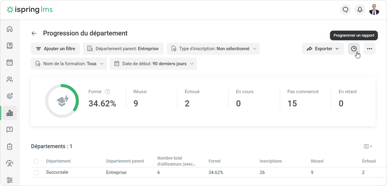 iSpring LMS enregistrera le modèle de rapport avec les filtres appliqués et l'enverra aux destinataires à la date sélectionnée.