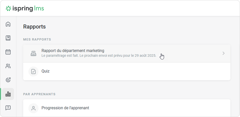 L'envoi par email des rapports de formation chaque semaine peut être une tâche fastidieuse, mais pouvez désormais vous en décharger. Dans iSpring LMS, vous n'avez à configurer qu"une fois qui doit recevoir quel rapport, et les destinataires recevront un rapport même lorsque vous êtes absent.