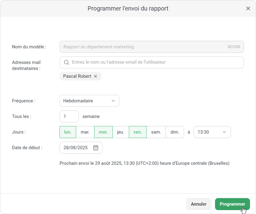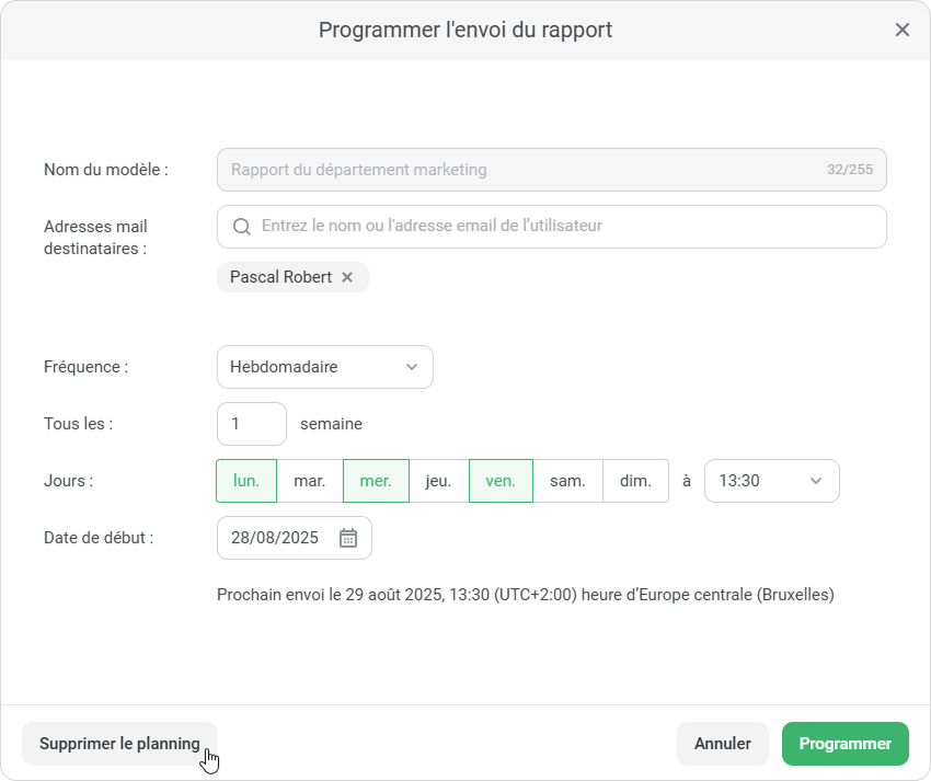 Il vous suffit d'ouvrir le modèle de rapport dans la section Mes rapports et de configurer les options d'envoi de rapport en suivant les instructions précédentes.
