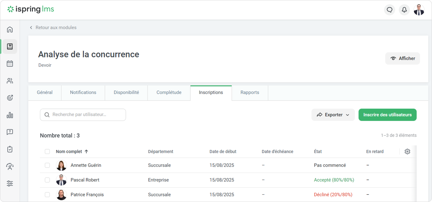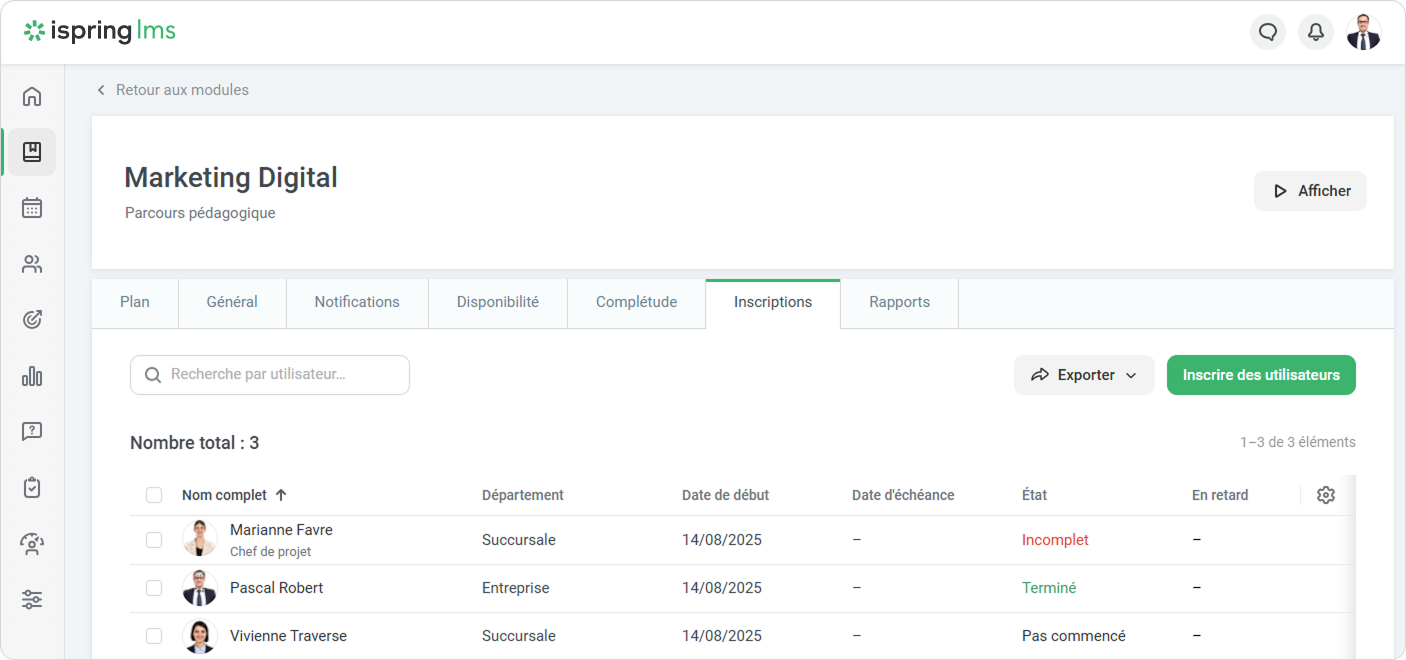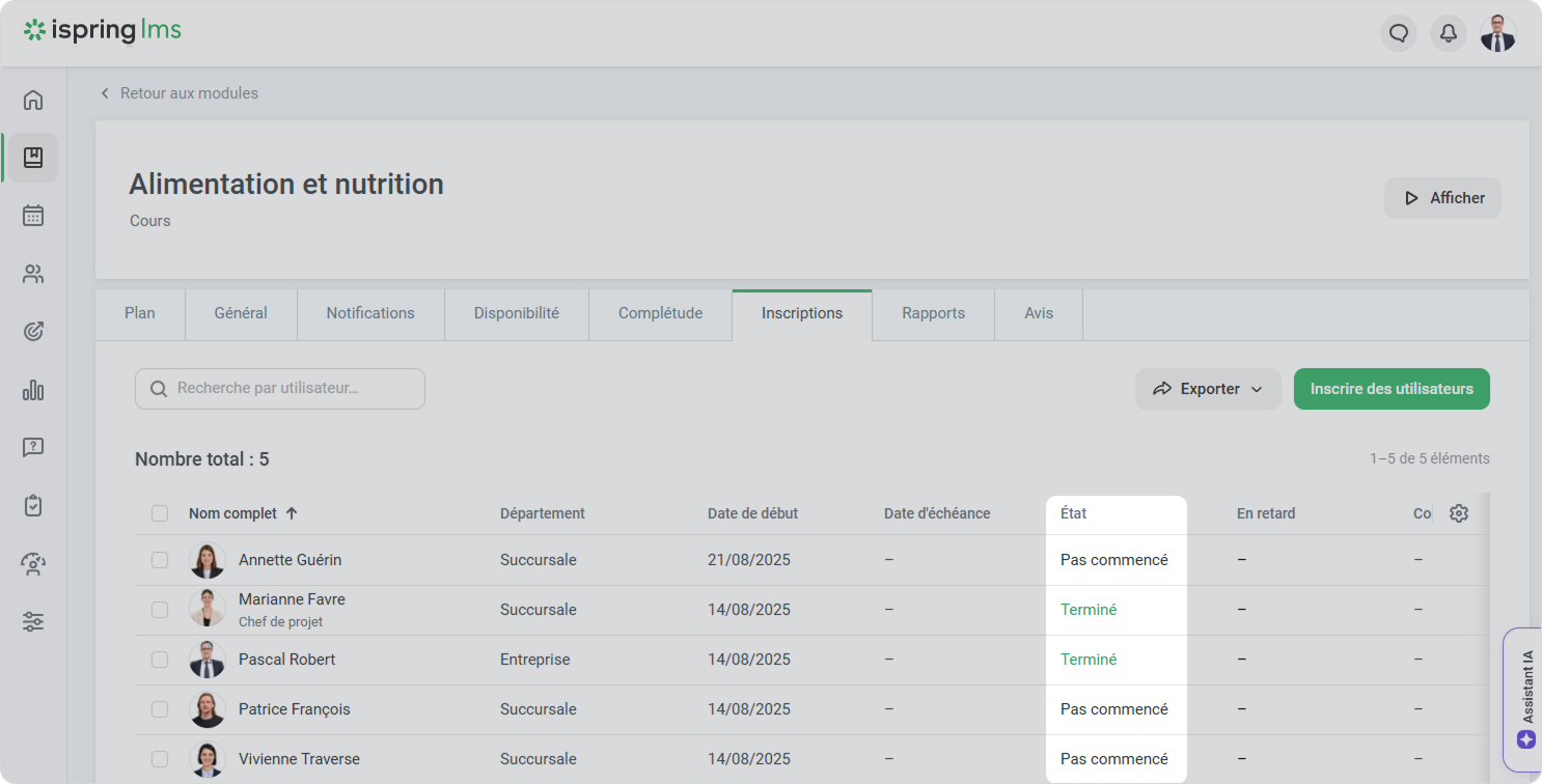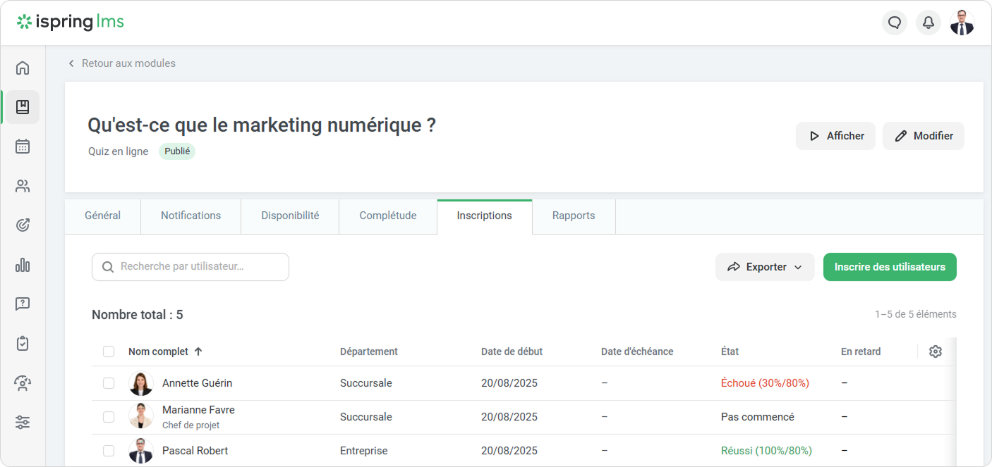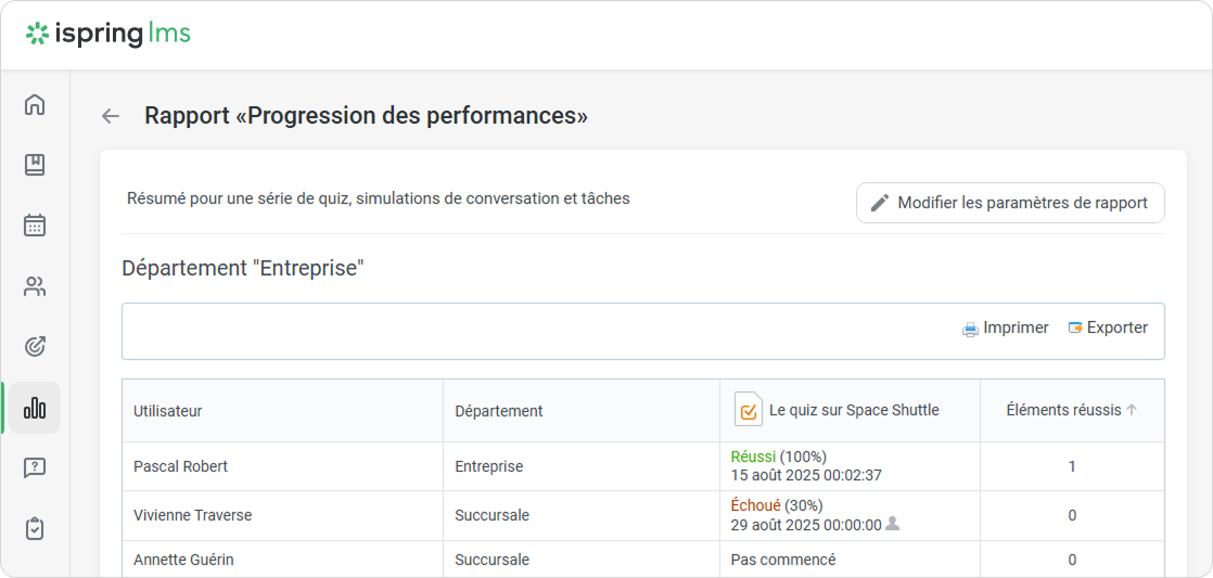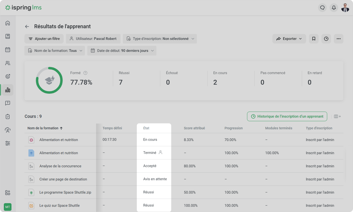 Les rapports pouvant être générés dans iSpring LMS montrent les performances des utilisateurs. L'état dans un rapport montre jusqu'où les utilisateurs sont allés dans un module, un cours, ou un parcours pédagogique.