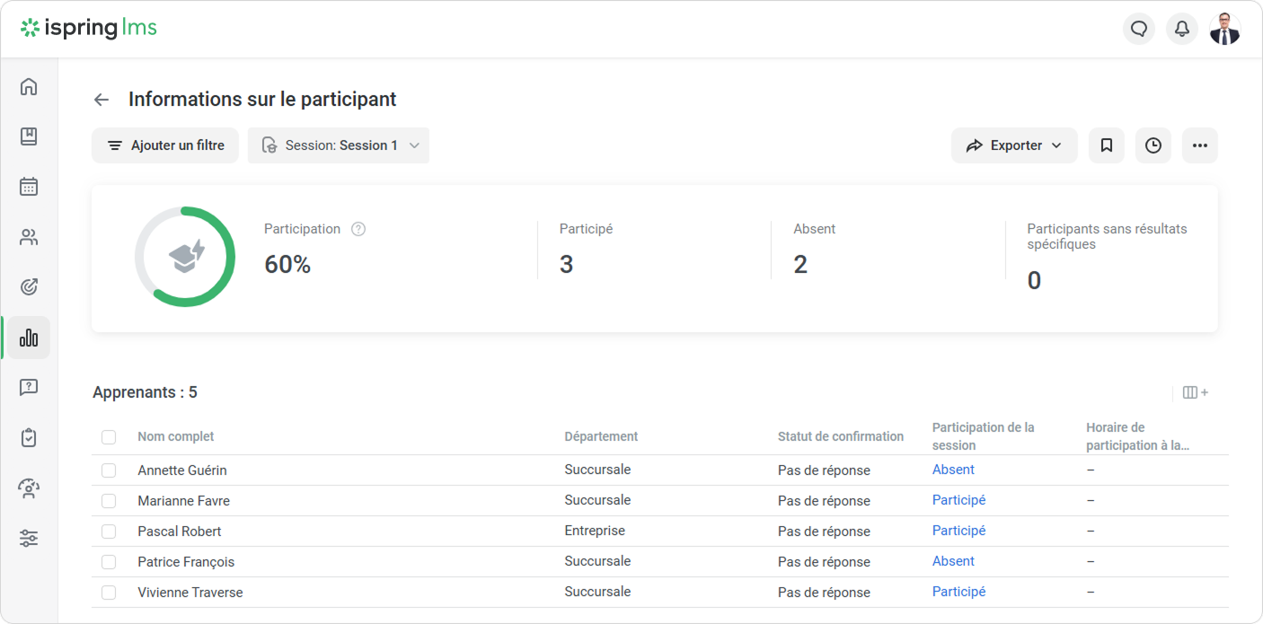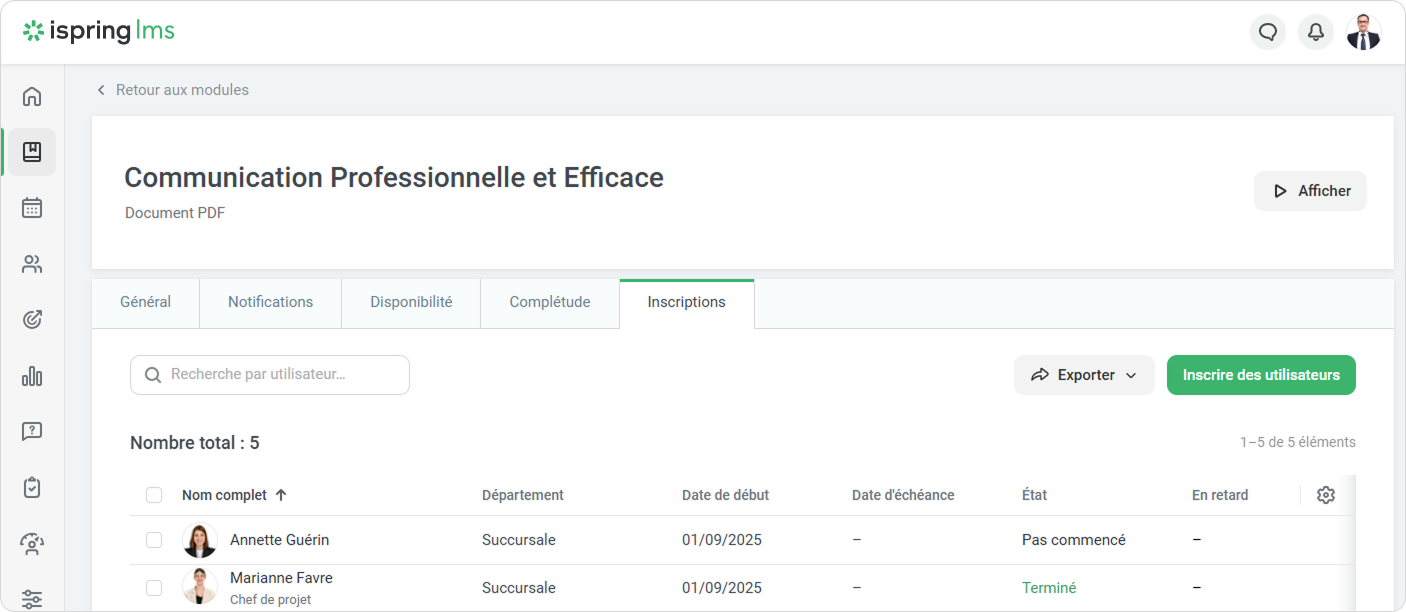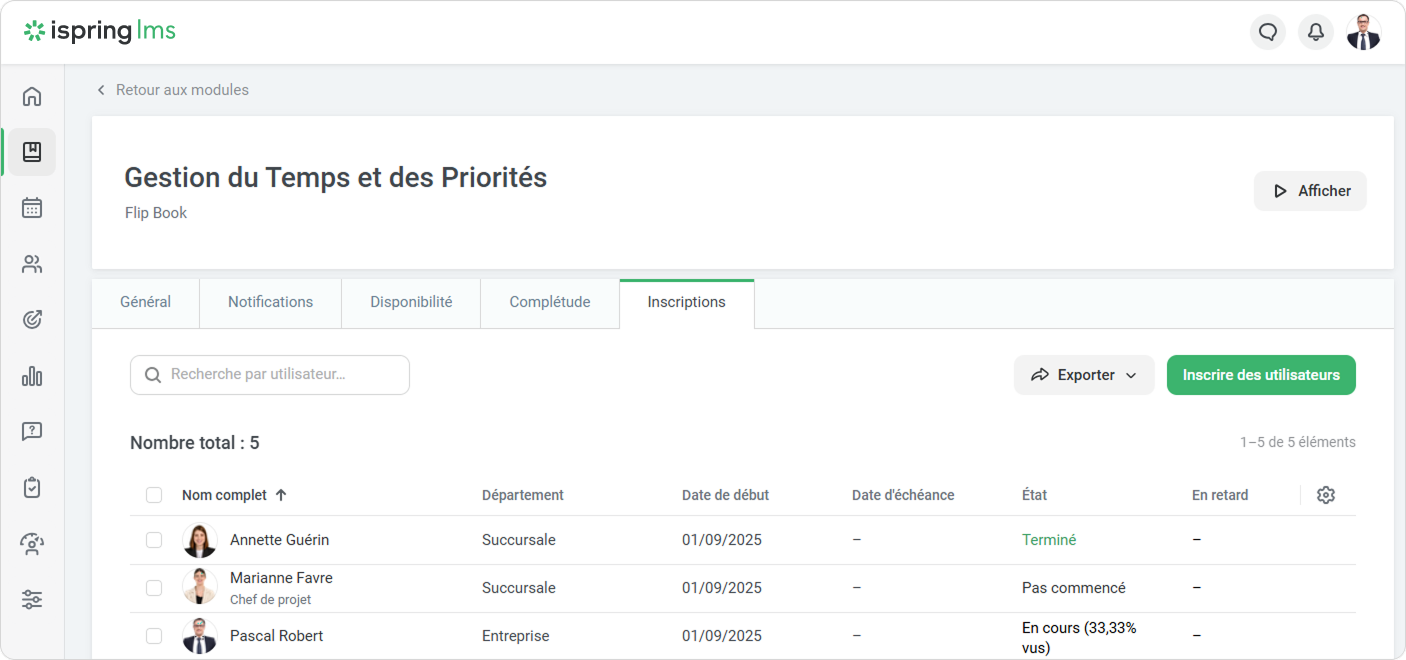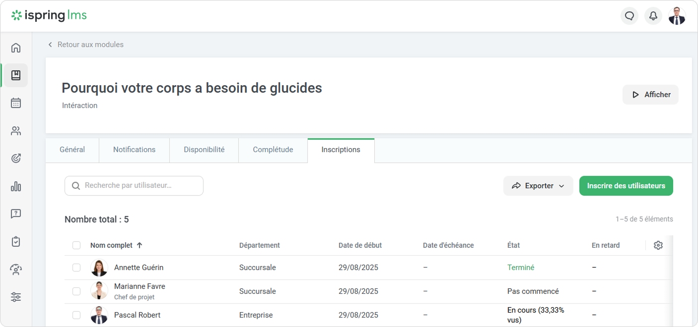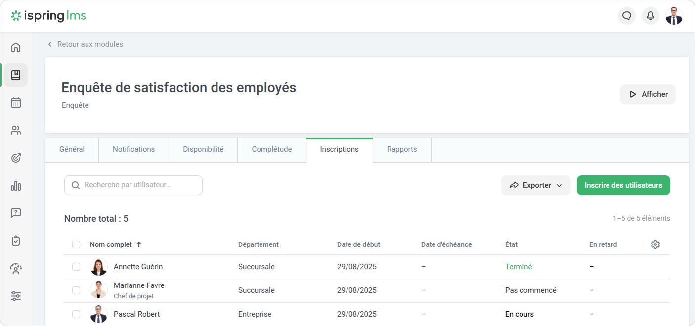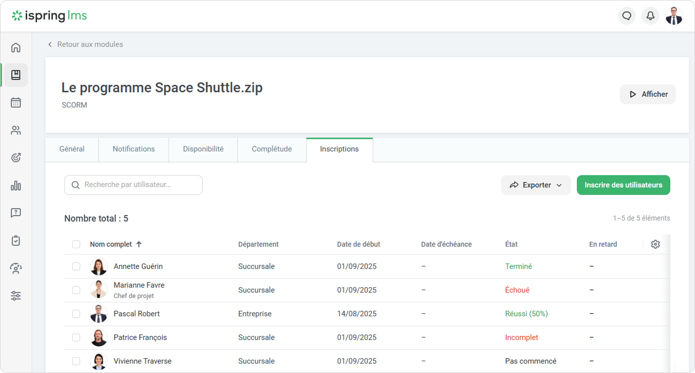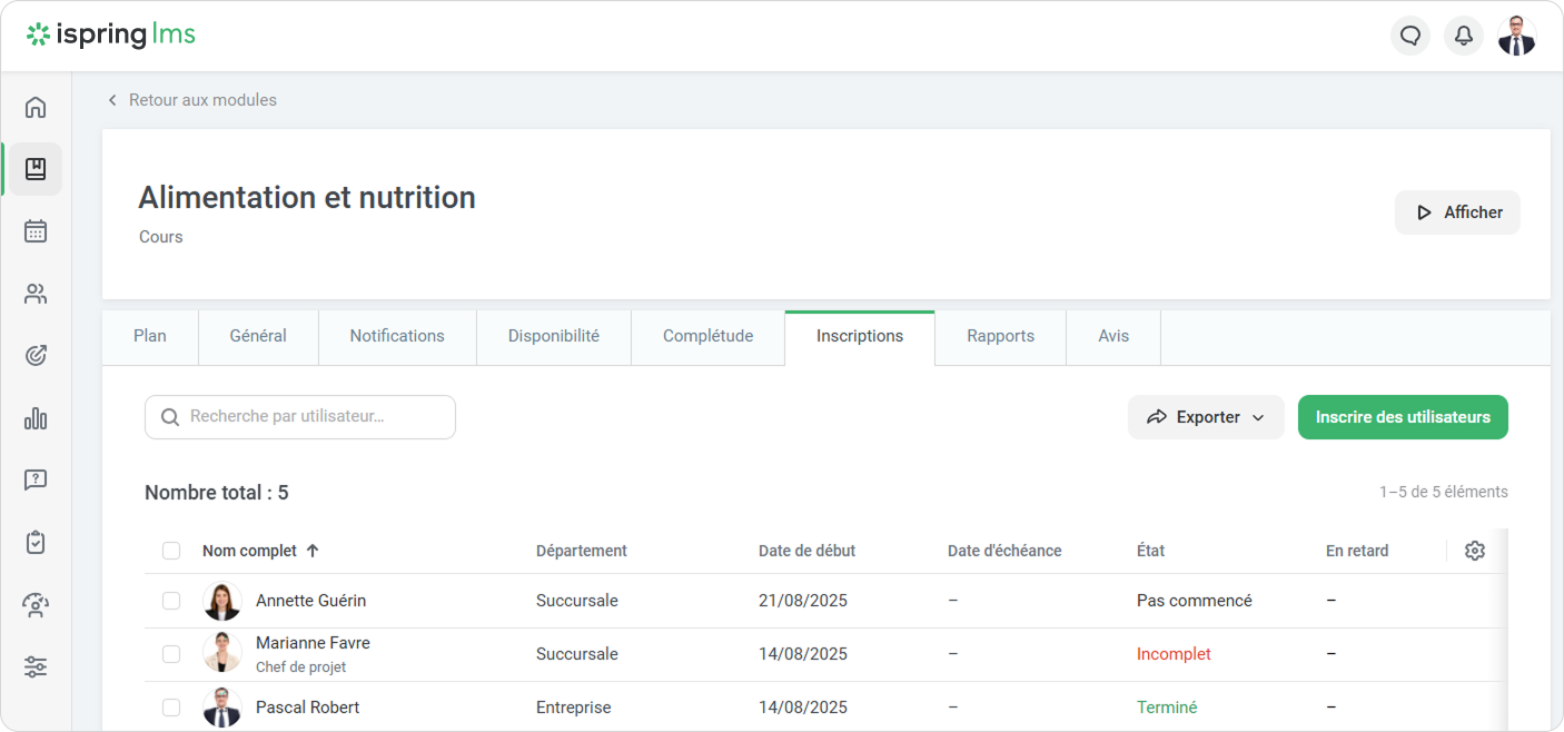 Les rapports pouvant être générés dans iSpring LMS montrent les performances des utilisateurs. L'état dans un rapport montre jusqu'où les utilisateurs sont allés dans un module, un cours, ou un parcours pédagogique.