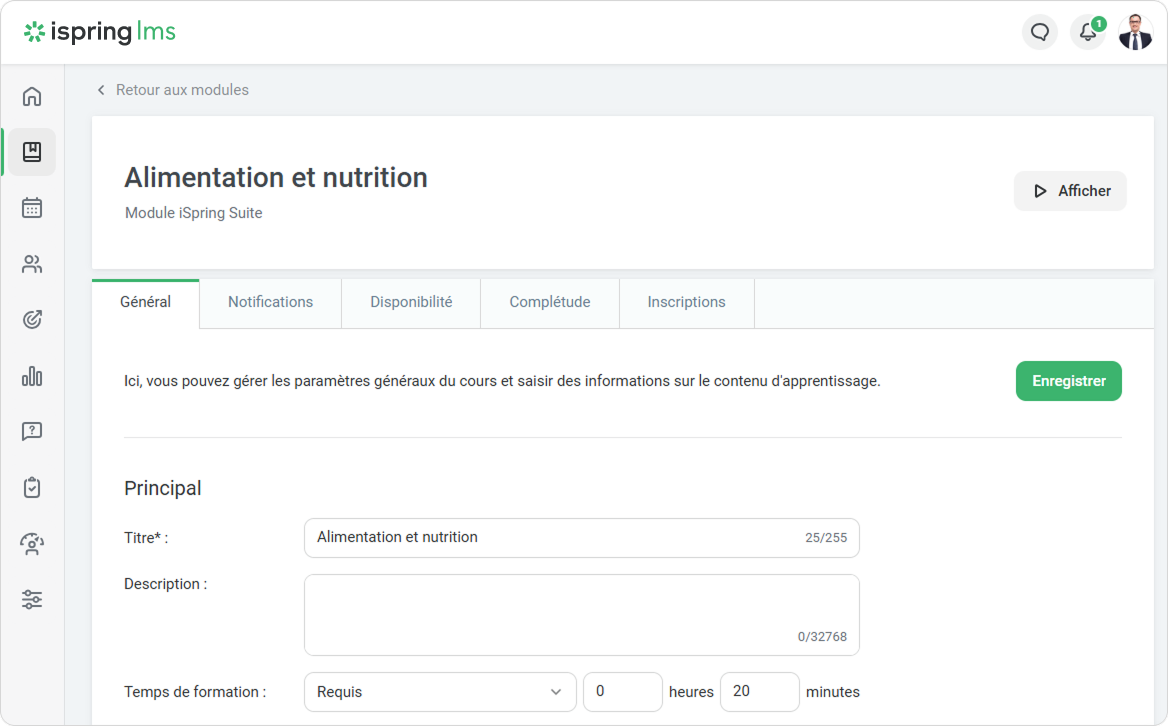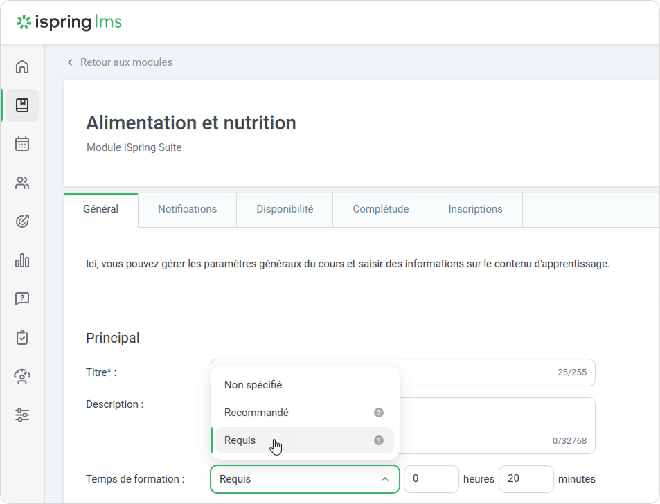Vous pouvez définir une durée minimale de cours pour répondre aux exigences de formation du secteur et garantir la conformité.
