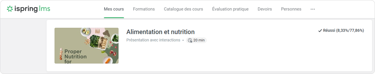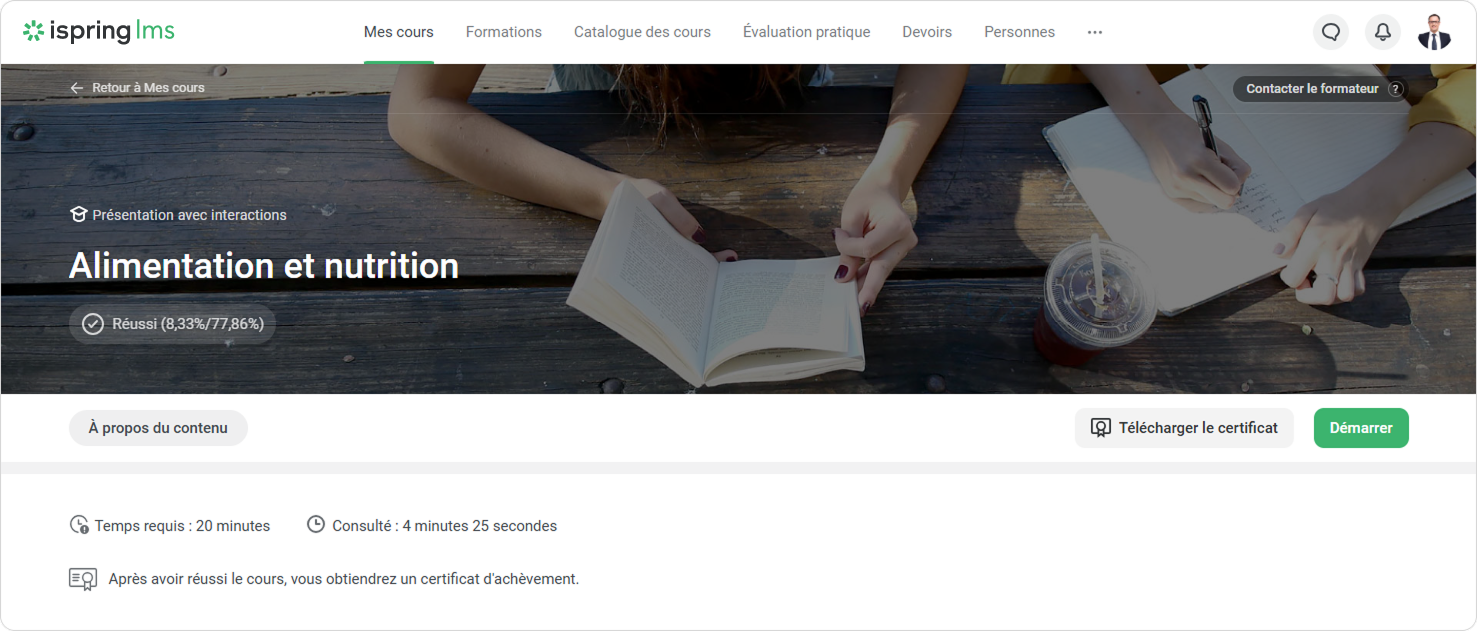 Les cours terminés affichent à la fois le temps obligatoire et le temps réel passé à apprendre.