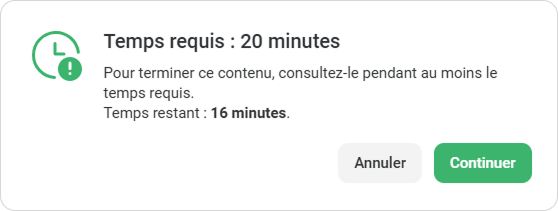 Lorsque vous lancez un cours, la plateforme affiche le temps minimum obligatoire pour le terminer.