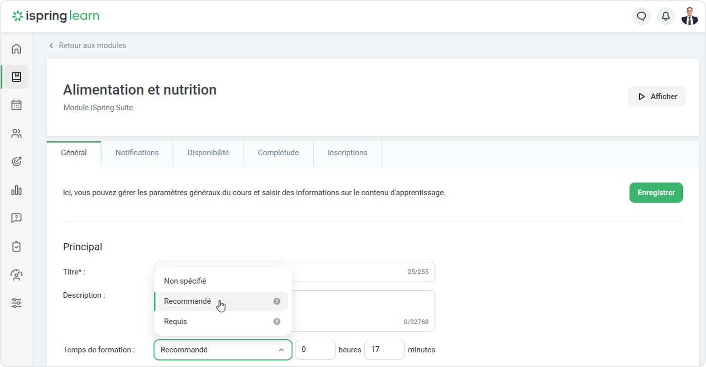 Vous pouvez définir un temps recommandé afin que les apprenants puissent planifier leur formation en conséquence. Voici comment procéder.