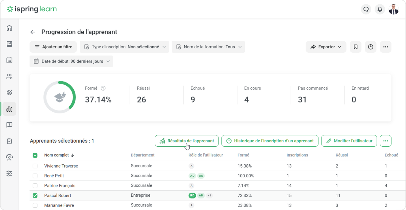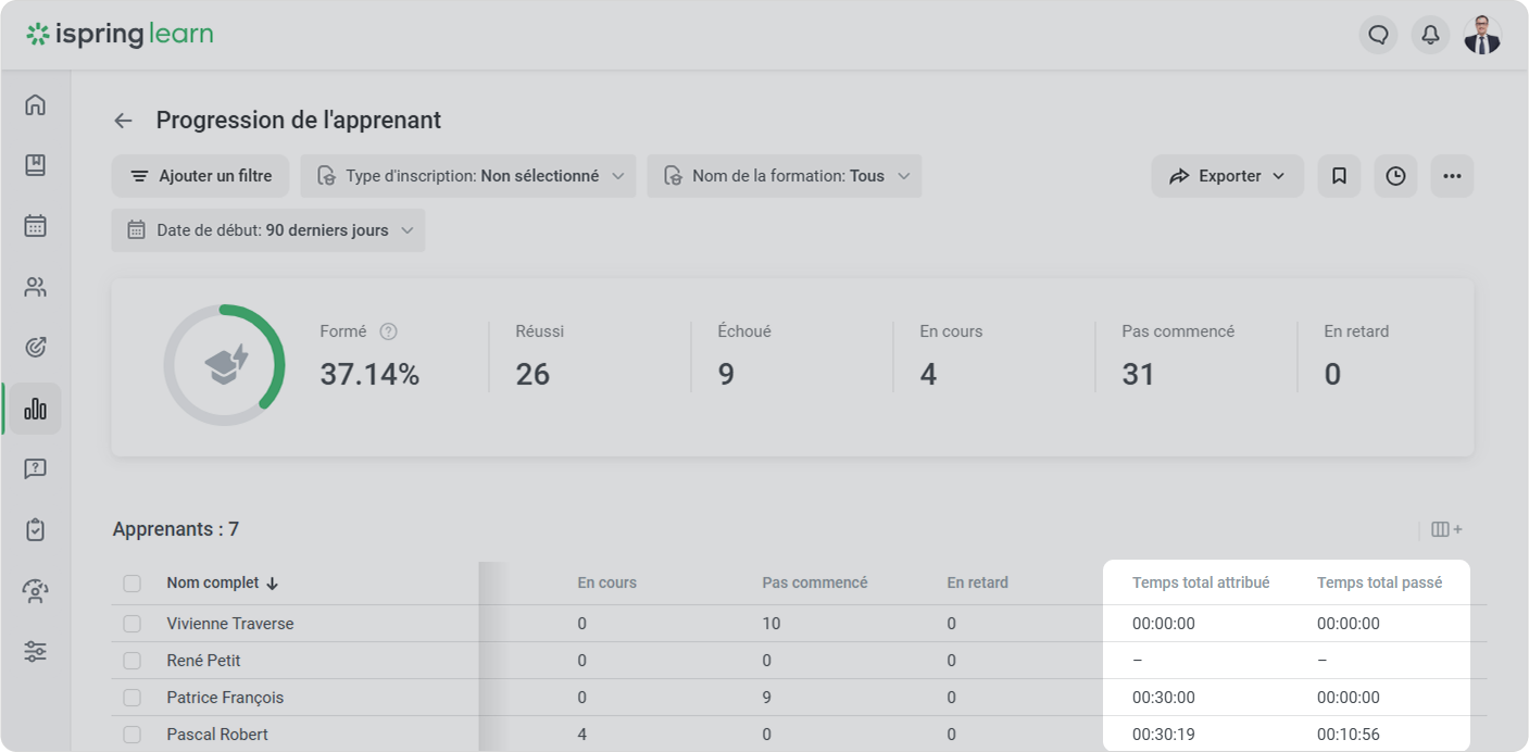 Deux nouvelles colonnes ont été rajoutées au rapport Progression de l'apprenant qui vous permettent de voir combien de temps un utilisateur a passé en tout sur les cours :