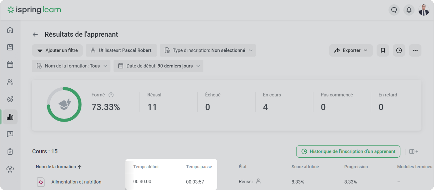Vous pouvez définir la durée recommandée d'un module de formation, d'un cours ou d'un parcours pédagogique, et consulter le temps réellement passé sur ceux-ci.