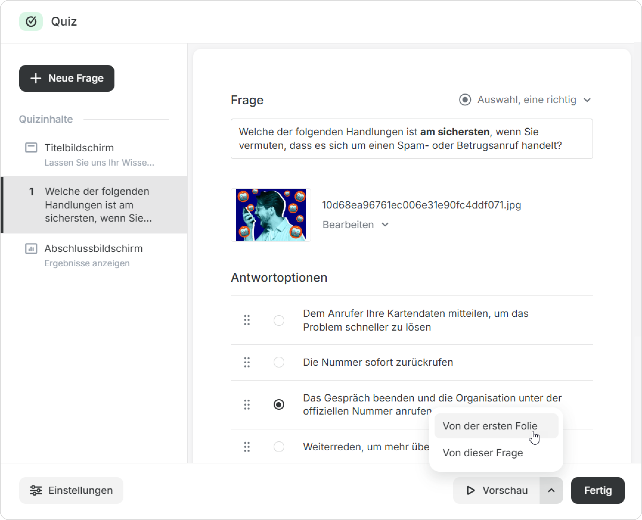 Wenn der Titelbildschirm deaktiviert ist, beginnt die Vorschau mit der ersten Frage.