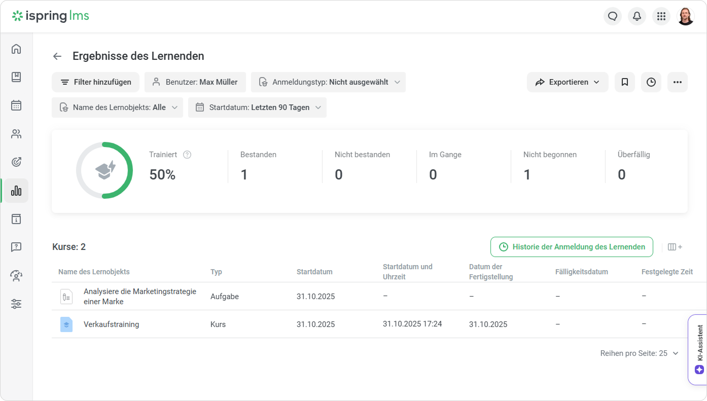 - Der Fortschritt eines Kurses kann mithilfe von Berichten überprüft werden. Zum Beispiel können Sie den Bericht über die Ergebnisse des Lernenden ausführen.