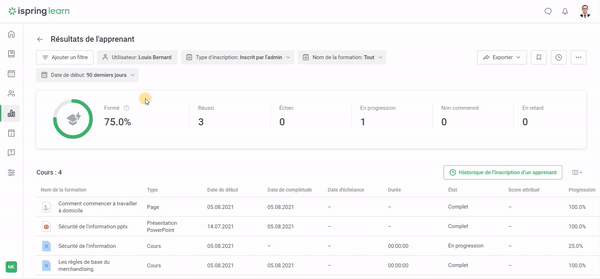 Essayons d'appliquer un filtre au rapport Résultats des apprenants. Par exemple, cliquez sur le filtre Statut et sélectionnez Achevés. Le rapport affichera uniquement les cours que l'utilisateur a déjà réussi.