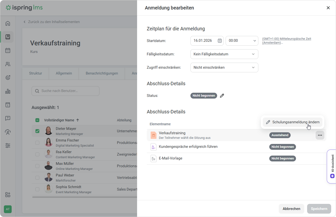 - Die Bearbeitung der Anmeldung zu einer in einem Kurs enthaltenen Schulung ist nur für Benutzer verfügbar, die die Berechtigung zur Bearbeitung von Kursen haben.